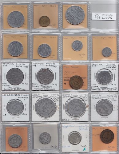 Includes: Bo 736-A-A Chappus Ojibwa Rev: one tune; Bo 948-A-A The Niebergall Rev: 1.oo, 50, 25, 10, 5, and 1; Parent Bros. Tecumseh Rev: 50c and 25c; Tecumseh Canning piece work Tecumseh, Ont. Rev: branch 53; similar to previous but in aluminum; obverse as previous Rev: branch 53 Dunnville, Ont; J.M. Pembleton Woodslee Rev: $1, 50c, 25c 10c and 5c; Wolf's Dinner Rev: Walkerville in 1982 suppl; Walkerville 3c cafeteria. VF to EF. 19 Pcs.