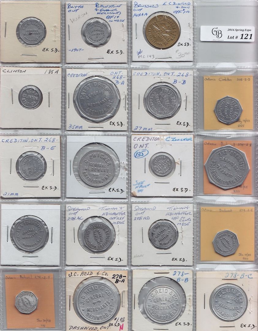 Includes: Poplestone Blyth Rev: 1c, Bo 148-A-A E.C. Dunnford Rev: $1 on a cash sale; G.N. McLaren Brussels Rev: 5 in 1982 suppl; At 185A R.C.A.F. Rev: one fare; Bo 268-B-A B-B B-D B-E Faist Bros. Crediton Rev: $1, 50c, 10 cents and 5c; C. Zwicker Crediton Rev: 50 and 1; Bo 278-A-A to A-F Tieman & Edighoffer Dashwood Rev: $1, 50c, 25c, 10 cents, 5c and 1c; Bo 278-B-A to B-C J.C. Reid Dashwood Rev: $1, 50c and 25c. F to EF. 19 Pcs.