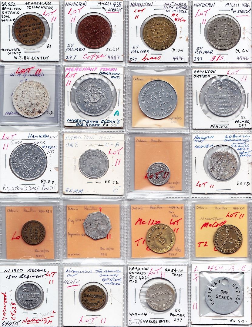 Includes: Br 852, Bo 464-A-A, W.J. Ballentine, St. Leon Water, Hamilton; Mc 435, The Canada Electro-Plating Co., rev: 1902 1903 Turkey, Hamilton, copper,10 struck; Mc 435a, as previous, brass, mintage not suggested; Mc 436, as previous, german silver, 10 struck; W.H. Gillard, Wholesale Grocers, Hamilton advert.,rev: We Give Quality and Service, holed, a bit rough; Investigate Cloak's advert., rev: Books Stationery etc. Hamilton; Mc 171, Leitch & Turnbull Canada ElevatorWorks Hamilton, rev: The Dominion Must & Shall Be Preserved (obv. of Ler 1572b), Al.; Peace's Metal Weather Strip Hamilton rev: Saves Storm Sash etc., Al. holed; Mc 710, Ralston's Shoe Polish, Hamilton, rev: Good Luck Horeshoe, Al.; Bo 464-C-A, Dominion Canners Factory 34 Hamilton, rev: Peeling 1 Pail Tomatoes; Bo 464-C-B, as previous, rev: 1 Labelling Case; Bo 464-AB-H, A.G. Bain, Hamilton, rev: 6c with 2 quart bottles; Bo 464-AQ-E, Relief Token 1c, Hamilton; Bo Suppl., S. Pollock Relief Token 5c, Hamilton, scarce; Mc 1200, Bo 464-K-E, McCormick House, Hamilton, rev: 5 Cents at the Bar, 2 Pcs. showing different rev.dies; Yarwood CT025, Canteen Token, Sargeants' Mess 13 Batt. Hamilton, uniface, variety with narrow SM, scarce; Bo 464-F-E, The Hamilton Grocery 5c; Br 776, Bo 464-M-E, Nobles Hotel Hamilton 5c; Bo 464-B-E, Registry Office M-E, Nobles Hotel Hamilton 5c; Bo 464-B-E, Registry Office, One Search, uniface, holed as made; Bo 464-F-E, The Hamilton Grocery 5c. F-AU. 20 Pcs.