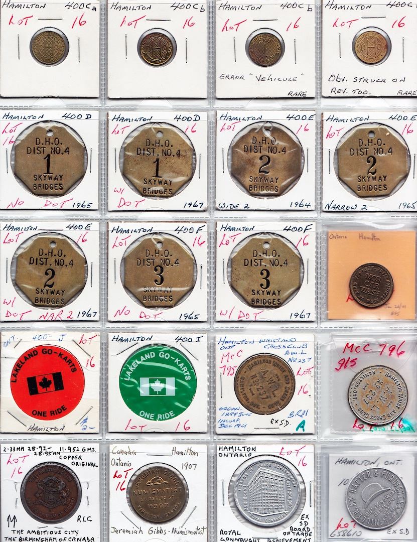 Includes: At 400Ca and b, Dept. Of Highways Ontario, Hamilton, rev: Class 1 Vehicle, large and small letters, 2 Pcs.; At 400Cb, as previous, spelling error "Vehicule", scarce; At 400Cb, as previous, error obverse on both sides; At 400D, D.H.O./ Dist No. 4 / 1 / Skyway/ Bridges, uniface; At 400D, as previous but with period after Dist.; At 400E, D.H.O./Dist No. 4/ 2/ Skyway/ Bridges, var. with wide 2, no period; At 400E, as previous with narrow 2; At 400E, as previous narrow 2 and period after Dist.; At 400F, D.H.O./Dist No. 4/ 3/ Skyway/Bridges, no period; At 400F, as previous, with period; MOR Car Wash token, Hamilton; At 400J, Lakeland Go-Karts, Hamilton, One Ride, orange and green plastic, uniface, 2 Pcs.; Mc 795, Hamilton Whist and Chess Club, brass, scarce; Mc 796, as previous, german silver, scarce; Jeremiah Gibbs Numismatist card (1907), Hamilton, copper original; as previous, restrike in brass in 1950's by The Hamilton Coin Club for anniversary; Royal Connaught Hotel, Hamilton, rev: Hamilton/An Ideal/Convention/City, advert., Al.; Miller My Hatter and Furnisher, Hamilton, rev: 10% on $1.00 and over etc., scarce. VF-EF. 20 Pcs.