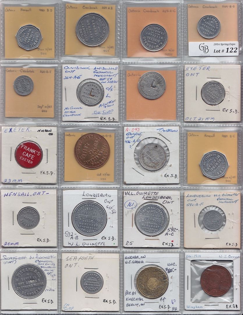 Includes: Bo 264-A-B to A-F A. McDonald, As previous but c/s L Rev: 5c in 1982 suppl; as previous but Rev: 10c; J.A. Stewart Exeter Rev: 5; Frank's Café Exeter Rev: 10c; Bo 428-A-B Cameron & Moore Goderich Rev: 50c on a 5 dollar; Bo 436-A-D T. Andrew Gorrie Rev: 10; Bo 480-B-C B-D E.Rannie Hensall Rev: 25 and 10; F. Manns Hensall Rev: 1 shave; Bo 592-A-B A-C A-F W.L. Ouimette Lonsesboro Rev: 50, 25 and 1; W. Picard Seaforth Rev 50; as previous but Rev: 5 in 1982 suppl; W.J. Greer Wingham brass Rev: Berlin Rubbers; as previous but copper. F to EF. 20 Pcs.