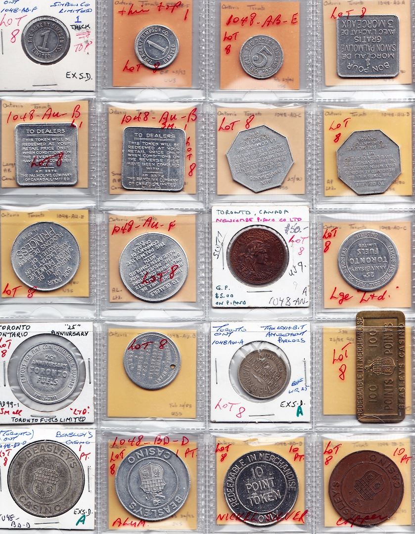 Includes: Bo 1048-AB-F, Robert Simpson Co., Toronto, value 1, biface, variety with thin top 1 and thick top, 2 Pcs.; Bo 1048-AB-(E), as previous, value 5; Bo 1048-AU-A, Palmolive token, square, French; Bo 1048-AU-B, as previous, English, variety with large. 1 and small 1, 2 Pcs.; Bo 1048-AU-C, and D, Palmolive token 8-sided, French & English, 2 Pcs.; Bo 1048-AU-E, and F, Palmolive token Princess Soap Flakes, round, French & English, 2 Pcs.; Bo 1048-AN-A, Newcombe Piano Co., Toronto, G/F $5.00 on a piano; Toronto Fuels 25th Ann'y., biface, lge. letters and small letters, 2 Pcs.; Bo 1048-AV-B, Alexandra Co. Millinery Toronto, rev: 50c on $5 purchase, holed; Bo 1048-AW-A, The Exhibit Amusement Toronto, biface; Bo 1048-BD-(F), Beasley's Casino, Toronto, rev: 1 Point, wm.; as previous, aluminum; Bo 1048-BD-D, Beasley's Casino, Toronto, rev: 10 Point, nickel-silver and copper, 2 Pcs.; Bo 1048-BD-(A), Beasley's Casino, Toronto, 100 Points, uniface, brass, 55mm.x25mm., scarce group. VF to Unc. 20 Pcs.