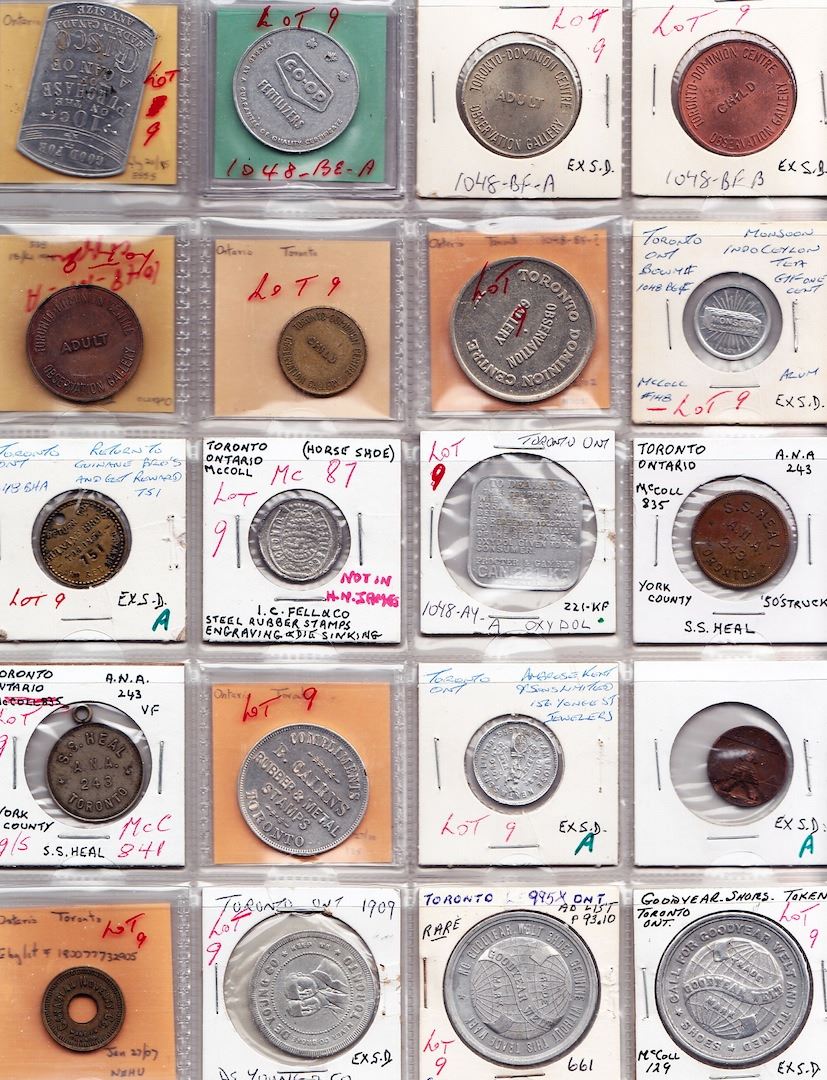 Includes: Crisco token, Toronto, shaped like a can, G/F 10c on purchase, rev: redeemed at 10c Procter & Gamble; Bo 1048-BE-A, Co-op Fertilizers, rev: $6 on a ton; Bo 1048-BF-A, TD Centre Observation Gallery Adult Admission, copper and wm. (2); Bo 1048-BF-B, as previous, Child Admission, copper; as previous, smaller size, brass; as previous, not designated Child or Adult, 36 mm., larger than both other sizes, nickel-silver; Bo 1048-BG-F, Mc 148, Monsoon Tea Toronto, 1c; Bo 1048-BH-A, Return to Guinane Bros. and get Reward, No. 751, uniface, holed; Mc 87, I.C. Fell, Toronto,small aluminum advert., horseshoe, rev: stamps, seals, stencils etc.; Bo 1048-AY-A, P&G Toronto, G/F 1 pkg. OXYDOL at 14c, square, alum.; Mc 835, S.S. Heal A.N.A. 243 Toronto, brass, rev: COINS MEDALS TOKENS, 50 struck; Mc 841, as previous, rev: leaf design, looped for suspension, german silver; B. Cairns Rubber & Metal Stamps Toronto, rev: Good Luck Swastika design (struck before WWII during which gov't officials ordered the die destroyed), Ambrose Kent & Sons, Toronto Jewelers, rev:ancient head; Astrolite Astrologer Lucky Talisman, rev: Sphinx; Canadian Novelty Co.,Toronto, rev: 5c ; De Young & Co. Toronto, rev: 3 Stores 1909; Mc 129, Ler 995x, Goodyear Welt Shoes, Toronto, two var. (2); VF-EF. 20 Pcs.