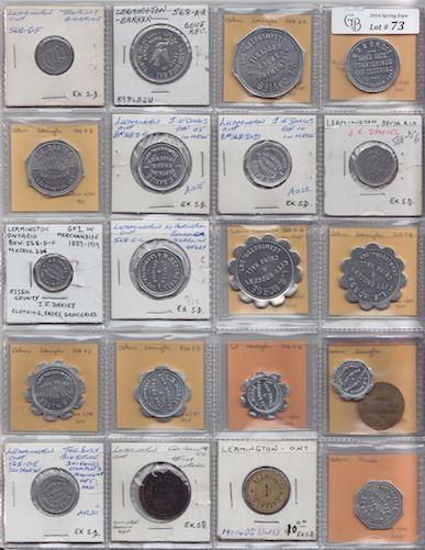 Includes: Bo 568-A-A R. Barker 25c on $5 Rev: dove; Bo 568-C-B W.D. & B.W. Cox Rev: 50 on $10; Bo 568-D-A to D-F J.E. Davies Rev: 1.oo, 50, 25, 10, 5 and 1; Bo 568-E-C W. Hepinstall Rev: 25c on a $5: Bo 568-F-A to F-F L.S. Morse Rev: 1.oo, 50, 25, 10, 5, and 1; Bo 568-G-E G-F S.G. Morse Rev: 5 and 1; Geo. Hallet Rev: 10c; Leamington, Ontario Rev: same as obv; Nitro's Rev: no cash value; J.H. Clark Olinda Rev: 25c. F to EF. 21 Pcs.
