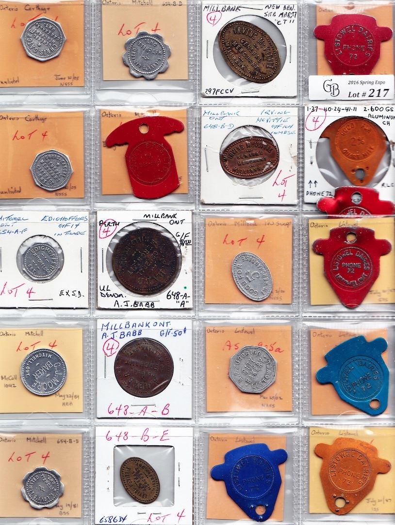 Includes: Carthage, Chris Gatcke, 5c,10 cents ; Bo 654-A-F, Mitchell, Edighoffer's 1c; Mitchell, Mc 1042 C.J. Moore 1 Loaf; Bo 654-B-D, E, Mitchell, F. Levy's 5c,10c; Mitchell, Stacey Bros. 1 Quart (red); Bo 648-A-A, B, Millbank, A.J. Babb $1,50c ; Bo 648-B-C, D, E, Millbank, Irving McVittie 25c, 10c, 5c ; Millbank, Bo Suppl., R.B. Hamilton 5c; As 0905a, Listowel, M.F. Zurbrigg 1 Loaf; Listowel Dairies 1 Skim Quart (blue)(2), 1 Quart Homo (red)(3), G/F 2% Quart (gold)(2). F to EF. 21 Pcs.
