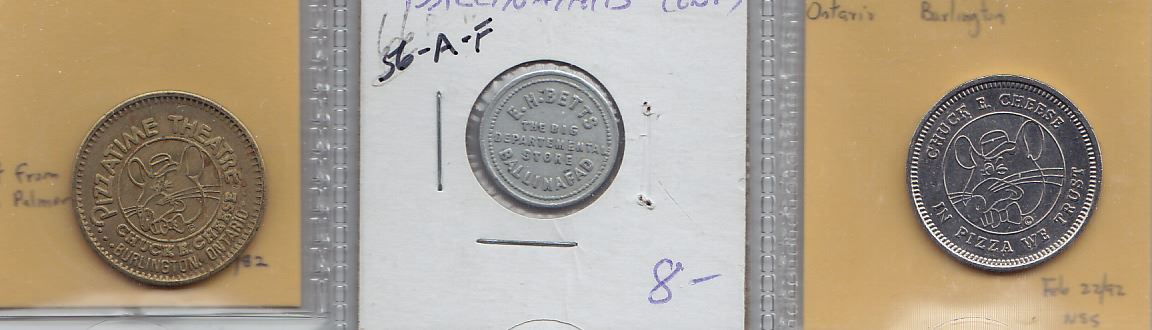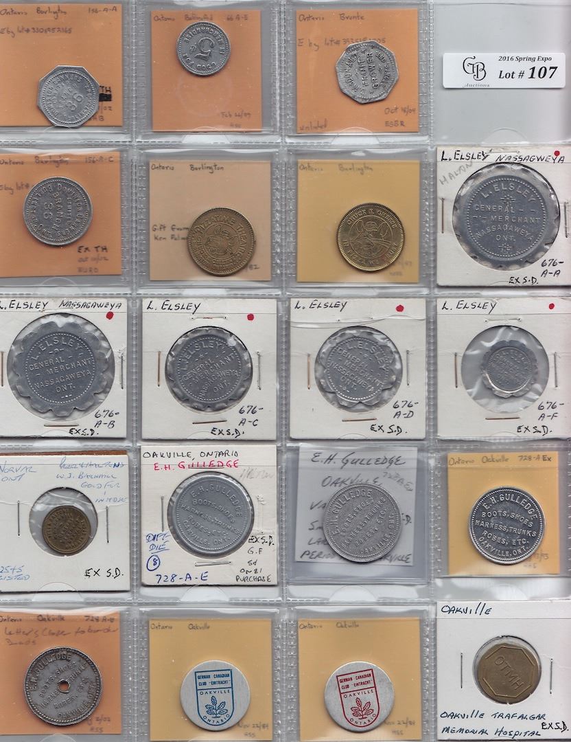 Includes: 66-A-E E.H. Betts Ballinafad Rev: 5c; as previous Rev: 1; D. McDonald Bronte Rev: 25c unlisted; Bo 156-A-A A-C Dominion Canners Burlington Rev: Tomatoes and strawberry; four Chucky Cheese tokens; Bo 676-A-A to A-D A-F L. Elsley Rev: $1, 50c, 25c, 10c and 1c; W.J. Barnhill Norval Rev: 1; Bo 728-A-E A-Ew A-Ex E.H. Gullegde Oakville Rev: one dollar purchase.; similar to 728-A-E but letters closer to border beads; German Canadian Oakville (blue); as previous but red; OTMH parking token. VG to EF. 22 Pcs.