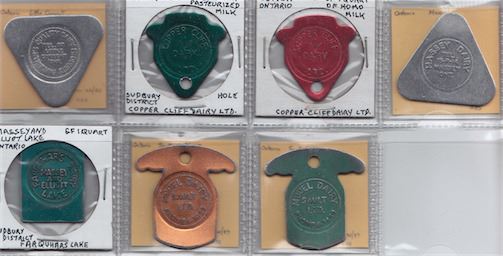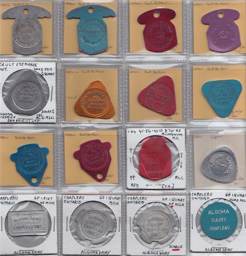 Includes: Farquhar's Dairy Massey and Elliott Lake (green) 1 quart; Model Dairy Sault Ste Marie (gold) 1 quart; (green) 1/2 gallon homo; (alum) 1/2 gal 2%; (blue) 1 quart skim; (red) homo one 3 qt jug; (purple) 2% one 3 qt jug; Soo Dairies (alum) 1 quart; (gold) 1 quart; (red) 1/2 gallon jug; (blue) 1/2 gallon homo; (blue) homo one 3 qt jug; (red) 2% one 3 qt jug; Horth Shore Co-op Thessalon (red) 1 quart unlisted; Laitrie Capreol Dairy (alum) 1 quart; Algoma Dairy Chapleau 1 pint; 1 quart; 1 quart of; (blue) 1 quart homo; Copper Cliff Dairy (green) 1 quart pasteurized; (red) 1 quart homo; Massey Dairy (alum) 1 quart; Farquhar's Quality Dairy Little Current 1 quart. F to EF. 23 Pcs.