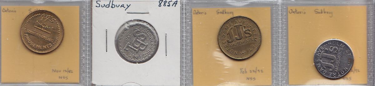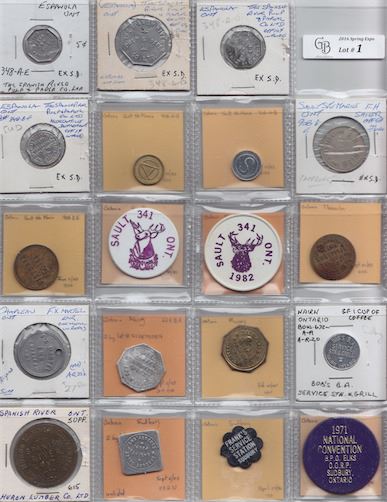 Includes: Bo 348-A-B A-D A-E The Spanish River Co. (Espanola) Rev: 50c, 10c and 5c; Bo 348-B-F The Spanish River Co. Espanola Rev: 1c; Bo 908-A-A A in circle (Sault Ste Marie); Bo 908-A-B S in circle (Sault Ste Marie); Bo 908-B-E F.H. Shier Sault Ste Marie Rev: 5c; Bo 908-D-E Victoria Hotel (Sault Ste Marie) Rev: 5 cents; Sault 341; Sault 341 1982; G. Carufel Thessalon Rev: 10c unlisted; F.X. Martel Chapleau Rev: one meal in 1982 suppl; Bo 624-B-A Cutler Bay Lumber Massey Rev: one meal; H. Sadowski Massey Rev: one meal c/s VOID unlisted; Bo 672-A-A Bob's Nairn Rev: coffee; Huron Lumber Co. Spanish River uniface in 1982 suppl; Sudbury Dairy Sudbury Rev: 10c unlisted; Frank's Service Station Sudbury Rev: 18c; 1971 Elks Convention Sudbury; At 885A Sudbury Bus Lines; 3-amusement tokens. F to EF. 23 Pcs.