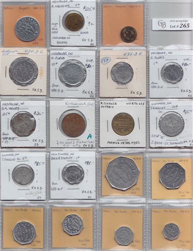 Includes: A. Hagmeier Hespeler Rev: 5; Bo 484-A-F as previous Rev: 1; Bo 484 B-D J.E. Klager's Hespeler Rev: 10c; 484-D-C to D-F R. Purvis Hespeler Rev: 25c, 10c, 5c and 1c; Bo 484-E-C G.M. Henry Hespeler Rev: 25; Jacques Furniture Rev: figure with bow; Kitchener parking transit token; T. Ruggle Linwood c/s B Rev: 10c; T. Ruggle Linwood Rev: 5c; 688-A-F Buck & Schmitt New Dundee Rev: 1; Bo B-A to B-F E.H. Thamer New Dundee Rev: 1.oo, 50, 25, 10, 5 and 1; Bo 688-C-C C-D A.C. Clemens New Dundee Rev: 25c and 10c; Bo 688-D-D HK & Co New Dundee Rev: 10c; Bo 688-F-F H. Kavelman New Dundee Rev: 1c. G to EF. 23 Pcs.