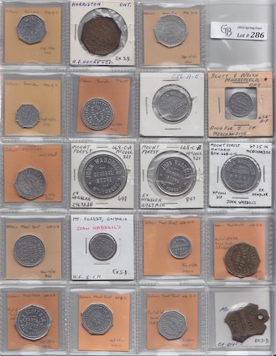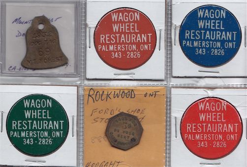 Includes: Bo 472-A-A A-C A-D A-F R.J. Henry Harriston Rev: 1.oo, 25, 10 and 1; Whaley & Clarke Harriston Rev: 10c; Bo 656-A-E A-F Scott & Welsh Moorefield Rev: 10 and 5; W. Innes & Son Moorefield Rev: 25c unlisted; Bo 668-C-A to C-F John Waddell's Mount Forest Rev: 1.oo, 50, 25, 10, 5 and 1; Bo 668-D-A to D-C D-E R. Scott Mount Forest Rev: $1, 50c, 25c and 10 cents; two - dog tag Mt. Forest 1929 and 1932; four -Wagon Wheel Restaurant Palmerston Rev: coffee; Bo 888-A-E Ford's Rockwood Rev: 5c. F to EF. 25 Pcs.