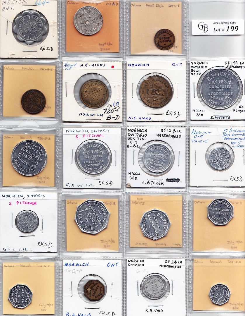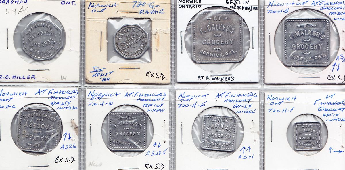Includes: Bo 664-A-D B. Glynn Mt Elgin Rev: 10; Bo 644-C-E Wonderland Mount Elgin Rev:1c; Matheson & Boult Mt Elgin Rev: 25c; Bo 720-A-E A. Catton Norwich Rev: 5c; Bo 720-B-D N.E. Hicks Norwich Rev: 10; Bo 720-C-C N.E. Hicks 25c Norwich Rev: clasped hands; Bo 720-E-A to E-F S. Pitcher Norwich Rev: 1.oo, 50, 25, 10, 5 and 1; Bo 720-G-B G-D G-E to G-G R.A. Vair Norwich Rev: 50, 25, 10, 5, 2, 2c and 1; as previous Rev: 5c; Bo 720-H-A to H-F F. Walker's Norwich Rev: $1, 50c, 25c, 10c, 5c and 1c; Bo 114-A-C R.O. Miller Breamar Rev: 25c. F to EF. 27 Pcs.