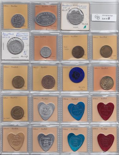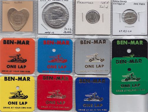 Includes: Bo 120-I-A McLaughin & Pfeiffer; Bo 120-K-A Brantford 15c service, Knowles' service 15c; 120-L-A Waddell/ One crate; Heath's shoe store/ 5c in 82 suppl; City of Brantford/ parking in 82 suppl; Brantford Gen. Hosp./ parking in 82 suppl; Terrance Hill Medical Centre/ parking; J.W. (Patty) Conklin 1892 - 1970; Conklin Shows, Gas Rite/ car wash; Pioneer in 82 suppl; Stan the shoe man/ 5c 10c 25c 50c in 82 suppl; Terrace Hill shoe store/ 5c 10c 25c 50c in 82 suppl; Geo V Crowned 1937/ Brantford; 125A Brantford ST. RY. Co. solid; 125A Brantford ST. RY. Co. centre holed; Ben-Mar one lap in orange, light blue, silver, black, yellow, red, blue and green. F to UNC. 31 Pcs.