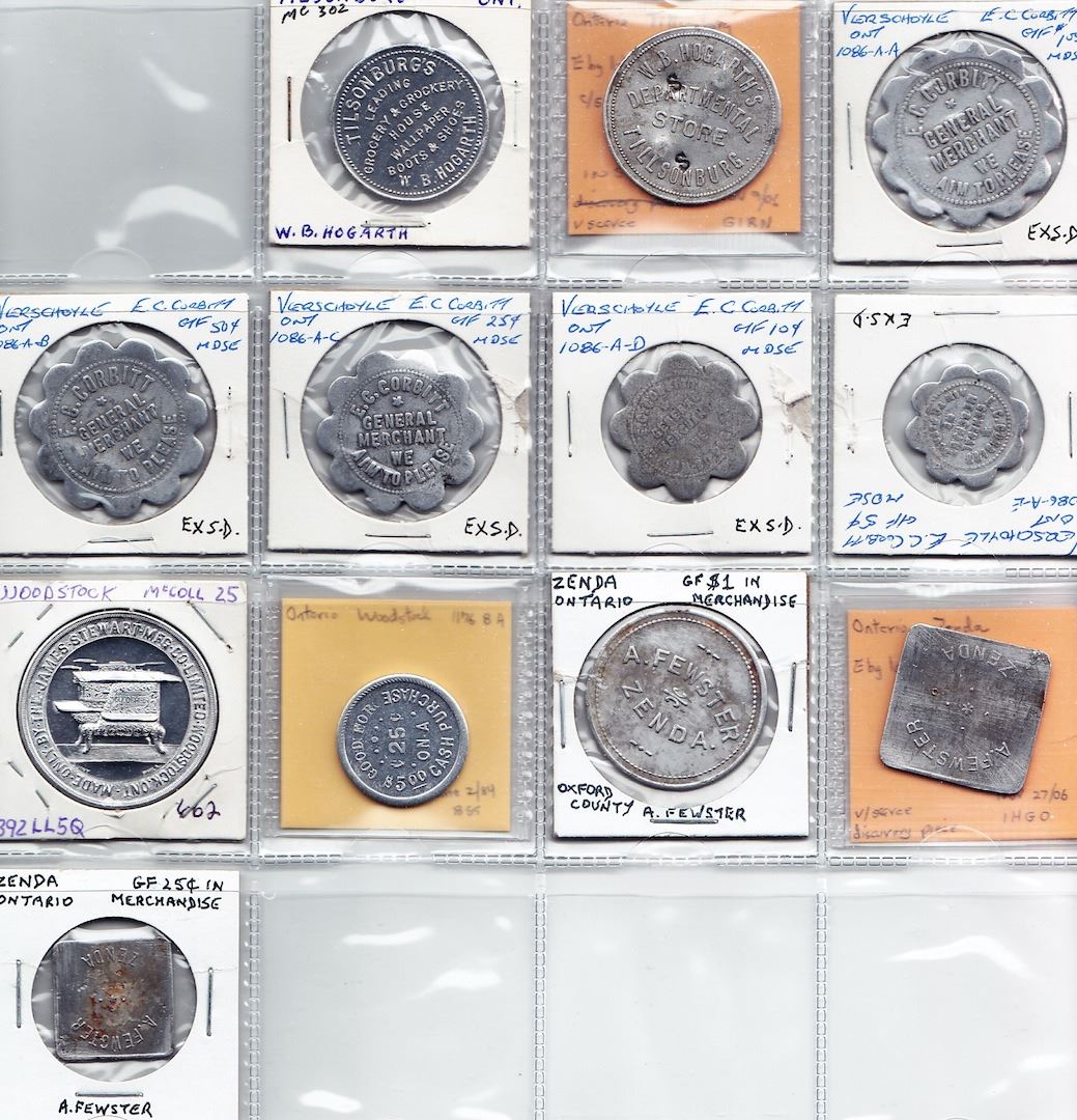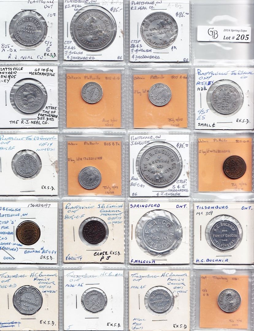 Includes: Bo 805-A-Az A-Bz A-DxD-Ey A-G A-Gx R.J. Neal Plattsville Rev: $1 c/s JES, 50c c/s JES, 10c c/s E, 10c c/s JES, 1c and 1c c/s E; as previous Rev: 10c small c c/s JES; Bo 805-B-F B-Fx R.D. Ramsay Plattsville Rev: 1c and 1c c/s E; Bo 805-C-Ay C-F J.B. English Plattsville Rev: $1 c/s SJ and 1c; as previous Rev: 1c c/s S; as previous different 1c obverse die P and J are close; F. Malcolm Springford Rev: $1; Bo 1036-A-C to A-F H.C. Buchner Tilsonburg Rev: 25, 10, 5 and 1; as previous Rev: 1c c/s SB; Bo 1036-B-A W.B. Hogarth Tilsonburg Rev: 50; W.B. Hogarth's Tilsonburg Rev: $1 c/s SS; Bo 1086-A-A to A-E E.C. Corbitt (Verschoyle) Rev: $1, 50c, 25c, 10c and 5c; Mc 25 James Stewart Woodstock Rev: Good Cheer Stove; Bo 1176-B-A J.M. Whitney Woodstock Rev: 25c on a $5; A. Fewster Zenda Rev: $1 in suppl; A. Fewster Zenda Rev: $1 and 25c in suppl. VG to EF. 31 Pcs.