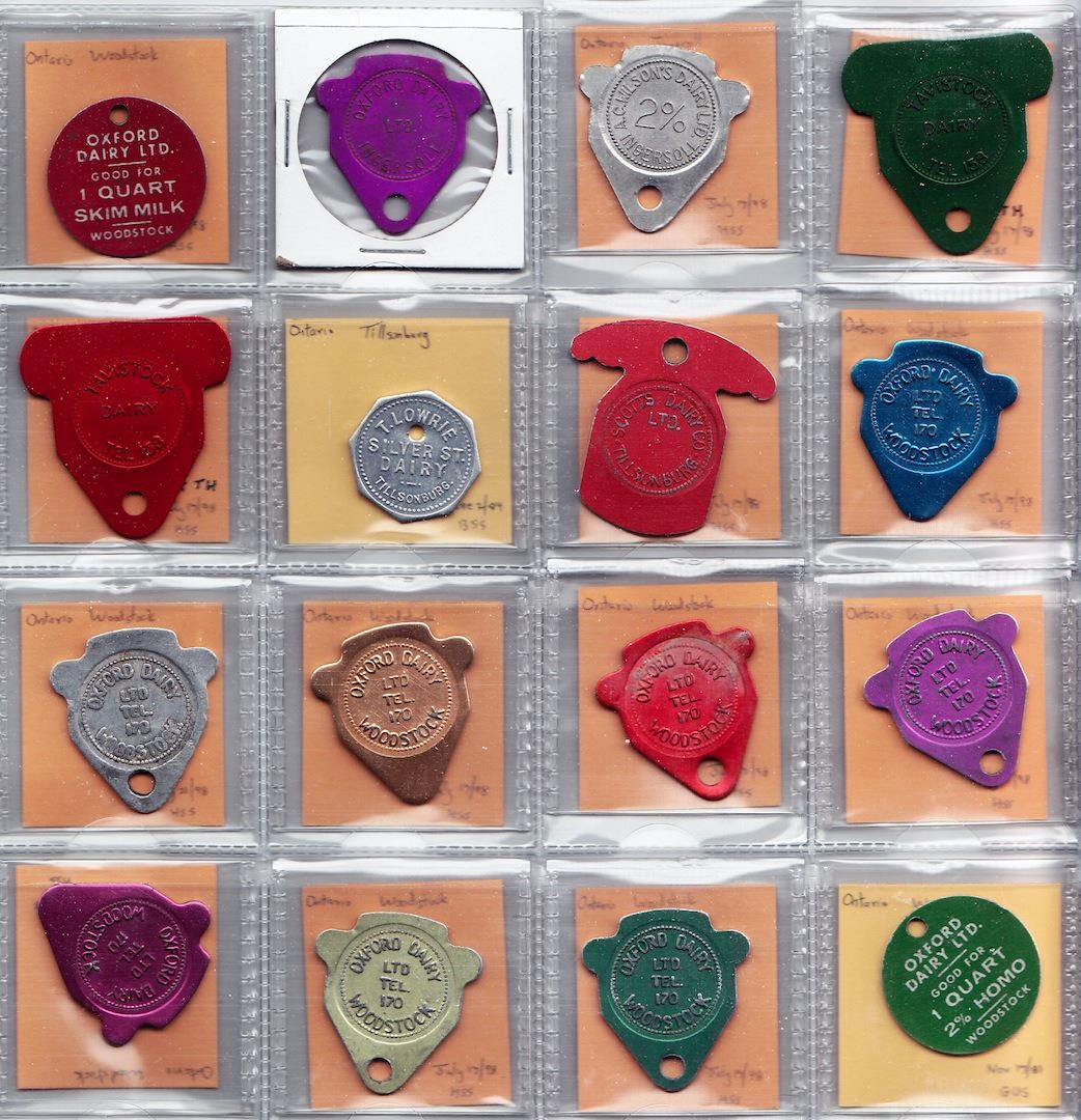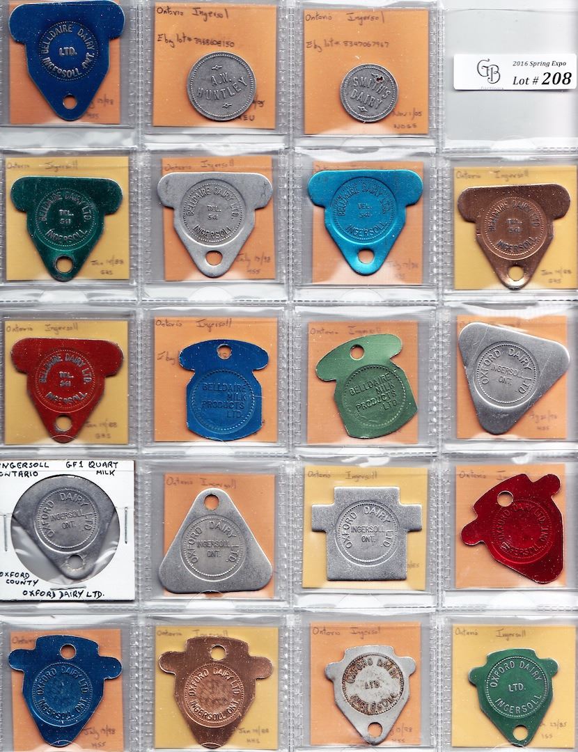 Includes: A.W. Huntley (Ingersoll) 1 pint; Smith's (Ingersoll) pint; Belldaire Ingersoll (blue) 1 quart; (green) 1 pint; 1 quart; (blue) 1 quart; (gold) 1 quart jersey; (bronze) non1fat quart; (blue) 2 quart homo; (green) 2 quart 2%; Oxford Dairy Ingersoll 1 quart; 1 quart bottom holed; 1 quart top holed; 1 quart; (red) 1 pint; (blue) 1 pint supreme; (gold) 1 quart non fat; (silver) 1 reg or homo quart; (green) 1 reg or homo quart; (purple) 1 supreme quart; A.C. Wilson's Dairy Ingersoll 2% 1 quart; Tavistock Dairy (green) 1 reg or homo quart; (red) 1 reg or homo quart; T. Lowrie Tillsonburg one quart; Scotts Dairy Tillsonburg 1 quart; Oxford Dairy Woodstock (blue) 1 pint; 1 quart; (gold) 1 quart jersey; (red) 1 quart jersey; (purple) 2 quart homo; (purple) non1fat quart; (light green) 2 quart 2% AJ; (green) 2 quart skim; (green) 1 quart 2% homo; (red) 1 quart skim. F to EF. 35 Pcs.
