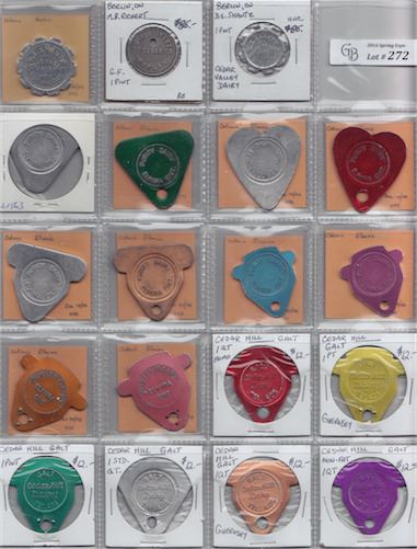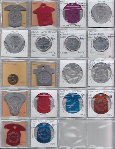 Includes: M.B. Rickert Berlin one pint; D.E. Shantz Berlin 1 pint and 1 quart; Purity Dairy Elmira 1 standard quart; (green) 1 standard quart; 1 homo quart; (red) 1 homo quart; 1 quart skim; (gold) 1 quart skim; (blue) 3 quart jug homo; (purple) 3 quart jug 2%; (bronze) 1 skim quart; (mauve) 1 quart homo; Cedar hill Dairy Galt (red) 1 homo quart; (yellow) 1 guernsey pint; (green) 1 pint; 1 standard quart; (gold) 1 quart guernsey; (purple) non1fat quart; (red) 1/2 gallon homo; (purple) 1/2 gallon non fat; Galt Dairy 1 standard quart; 1 homo quart; Mc Neil & Champ Galt 1 pint and one quart; Angus K. Scott Galt 1 pint; G.H. 1 pint Hespeler incused; Hespeler Dairy 1 quart pasteurized; 1 quart of homo; 1 quart skim; Sunny View Dairy Hespeler 1 pint; (red) 1 quart standard; (blue) 1 quart of homo; 1 skim quart; (red) 1 quart standard; (blue) 1 quart homo; (bronze) 1 skim quart. F to EF. 37 Pcs.