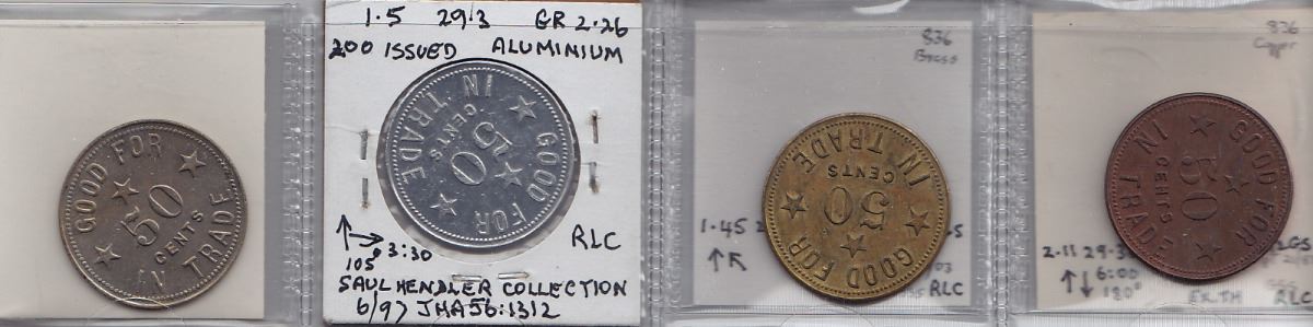 Includes: Br 836 F.J. Grenny/ Philatelist/ &/ Numismatist/ Ont./ Brantford. Rev: Good for/ 50/ Cents/ in Trade. Alum, Brass, Copper and WM. Unc. 4 Pcs.