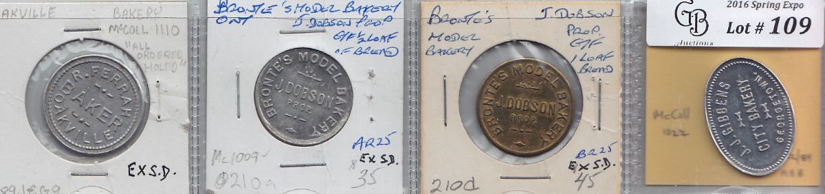 Includes: Mc 1009 J. Dobson (Bronte) Rev: 1/2 loaf; As 0210d J. Dobson (Bronte) Rev: 1 loaf; Mc 1022 J.J. Gibbens Georgetown Rev: 1 loaf; Mc 1110 R. Ferrah Oakville Rev: one half loaf. VF to EF. 4 Pcs.