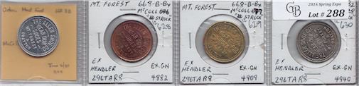 Includes: Mc 627 Allen Shoe Co. Rev: clasped hands; Mc 628 12 struck as previous; Mc 629 12 struck as previous; Mc 630 12 struck as previous. EF. 4 Pcs.