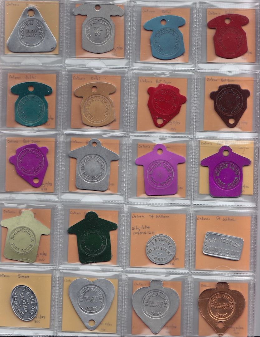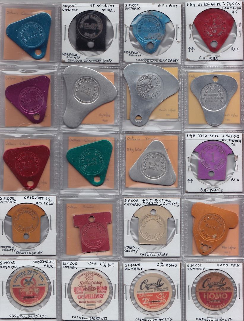 Includes: Delhi Sanitary Dairy 1 quart, (blue) 1/2 gal 2%, (red) 1/2 gallon homo, (blue) 1 quart 2%, (gold) 1 quart, Dover Dairy Port Dover (red) 1 quart homo, (bronze) 2 quart 2%, (purple) 2 quart homo, Hoover's Dairy Port Rowan 1 quart, (purple) 1 quart small 1, as previous but large 1, (light green) 1 3 quart jug, (green)2 quarts, A.S. Dedrick 1 pint and 1 quart, J.A. Elliott Simcoe one pint, Simcoe Sanitary Dairy 1 quart, 1 quart grade A, (gold) 1 quart grade A, (black) non1fat quart, (blue) 1 pint, (red) 1 quart of homo, (purple) 1/2 pint table cream, Caswell Dairy Simcoe 1 quart of homo, as previous but holed at bottom, 1 quart of homo, (red) non1fat quart, (blue) 1 quart jersey, (green) 1 pint, 1 standard quart, as previous but top holed, (purple) 1 homo quart, (gold) 1 quart 2% A.J. (all jersey) (red) 2 quart homo, (gold) 2 quart 2% jersey, (gold) 1 quart 2% A.J., 4 Caswell Dairy tops. F to EF. 40 Pcs.