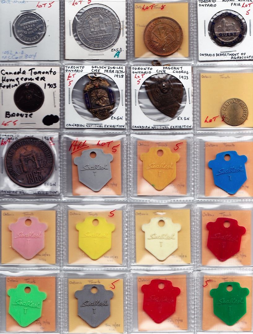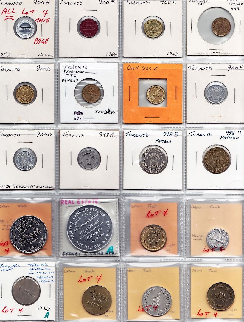Includes: At 900a, b, c, c var., d 2 var., e, f, and g, TTC subway tokens, 9 different; At 998a, b, and d, TTC tokens, 3 different; Dack Shoes 150 Year advert., Toronto, nickel or nickel-silver; Sidney K. Lamb, Realtor, Toronto and Acton, advert.; Mr. Video Toronto, rev: no cash value; Bluebird Wedding Rings, Toronto; Toronto Harbour Commission (T.H.C.), rev: Approved Material, scarce; College Park Shops, Toronto, biface; Borough of North York, Brooke Lot Parking Token; Borough of York, Toronto, 1975 Parking Token. EF; Bo 1052-A-B, Mc 804, J.R. Chisholm Toronto Junction, rev: 50c on suit or overcoat; Jewish Old Folks Home Toronto, $1.00 Contribution; Carry on Toronto Scottish, rev: Thumbs Up Aces High, copper; Royal Winter Fair Toronto, GUEST, uniface; Toronto Homecoming Festival 1903, rev: wreath, bronze, CNE 1928 Golden Jubilee Chorus medal; as previous, 1923 Pageant Chorus; York General Hospital Parking Token, brass; CNE 1963 souvenir medal, bronze; Sealtest Dairy tokens, Toronto, 11 different value and colour, plastic. VF to EF. 40 Pcs.