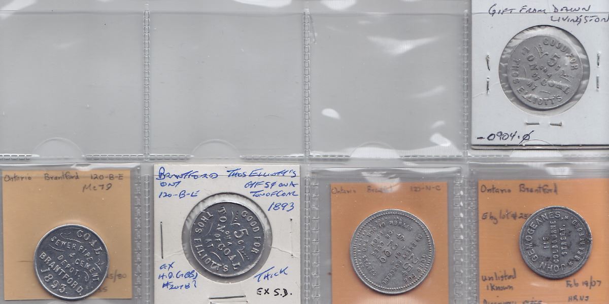 Includes: Bo 120-B-E 5c on a ton of coal at Thos. Elliott's, Brantford. Thin flan, regular flan and thick flan. F to UNC. Bo 120-N-C, The Roberts & Van- Lane Shoe Co; John Gemogeanes/ 115/ Colbourne/ Street. Rev: For one shine/5/ checks/ for 25/ cents unlisted. F to Unc. 5 Pcs.