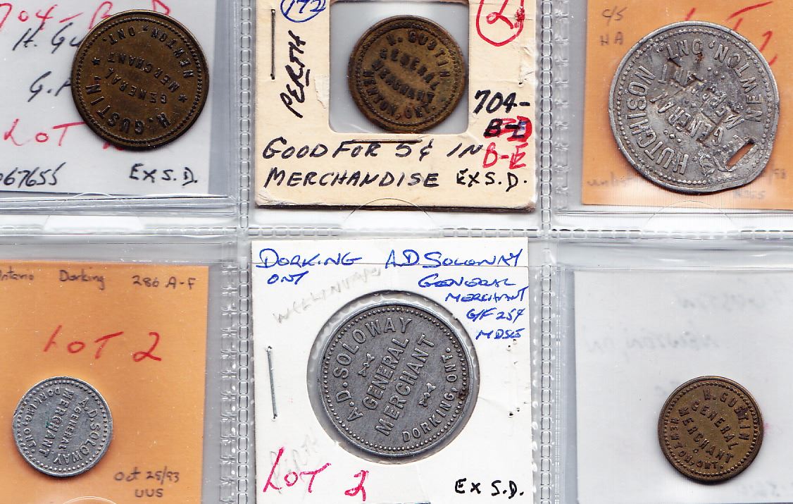 Includes: Bo 286-A-C, F, Dorking, A.D. Soloway 25c,1c ; Bo 704-B-D,E,F, Newton, H. Gustin 10c,5c,2c ; VF.-EF. Newton unl. S. Hutchison 50c , holed as a fob, a little rough. 6 Pcs.