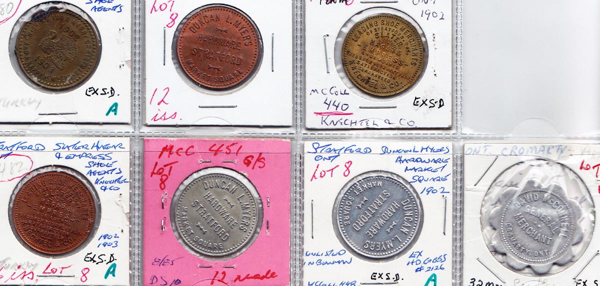 Includes: Stratford, Mc 440 Knechtel & Co. Leading Shoe Merchants 1902 ,Boer War/ Hands Shaking, brass; Stratford, Mc 480 Knechtel & Co. as previous, 1902 1903 Turkey, brass; Stratford, Mc 482 Knechtel & Co. as previous, Turkey, copper,16 struck; Stratford, Mc 448 Duncan L. Myers Hardware,rev: 1902 S.W.P. (Sherwin Williams Paint) alum.; Stratford, Mc 449, Duncan L. Myers, as previous, copper, 12 struck; Stratford, Mc 451, Duncan L. Myers, as previous, german silver, 12 struck; Cromarty, Bo unl., David McConnell Gen. Merchant 25c, Al. scalloped. VF to AU. 7 Pcs.