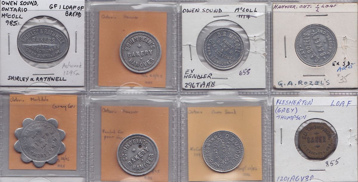 Includes: Ed. Thompson Flesherton Rev: one loaf, As 0700a G.A. Rozel's Hanover Rev: one half loaf; As 0705a Schinbein's Hanover Rev: 1 loaf; as previous but punched above R in bakery; As 1285a D.B. McColl Rev: one small loaf (in straight line); As 1285b D.B. McColl Rev: one small loaf; As 1295a Shirley & Rathwell Rev: 1 loaf; As 0985a J.G. Matthews Markdale 1 loaf. EF. 8 Pcs.