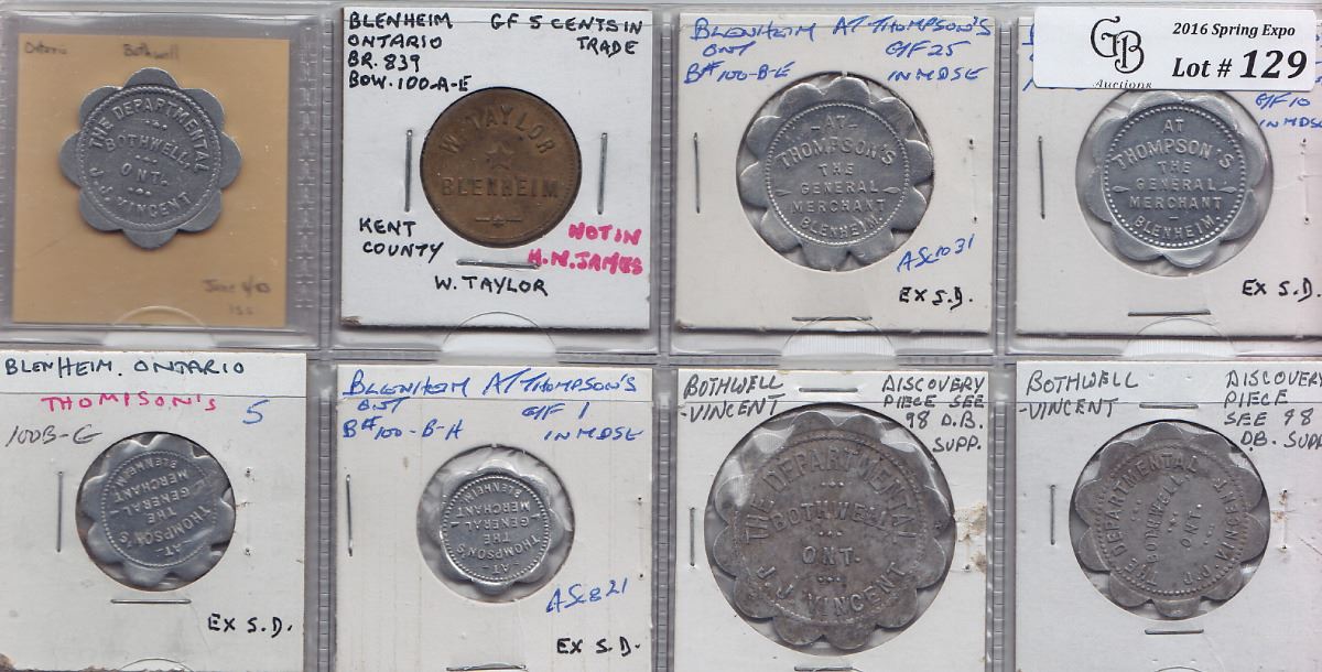 Includes: Br 839 W. Taylor Blenheim Rev: 5 cents; Bo 100-B-E to B-H Thompson's Blenheim Rev: 25, 10, 5 and 1; J.J. Vincent Bothwell Rev: $1, 25c and 10c. F to EF. 8 Pcs.