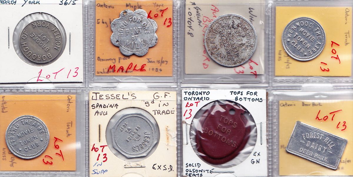 Includes: Bo Suppl., Jessel's, Toronto, rev: five5cents in trade; Olsonite Seats, Toronto, Tops for Bottoms, unusual bathroom fixture advert. Red plastic or Olsonite?; Mc 1173, Forest Hill Dairy Deer Park, Toronto, 1 pint, rect. Al.; Borough of North York Brooke Lot Parking token; W.P. Huff, Maple City Dairy,rev: One Pint Milk, scall., Al. Notation as discovery piece; Whimster & Wilcox, Aurora & Bradford, rev: 50c, scarce; Kenwood Theatre Movie Token Club, Toronto, rev: one cent cash surrender value; as previous, Strand Theatre, Toronto. Part of a short series for movies. F-EF. 8 Pcs.