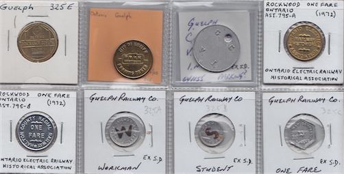Includes: At 325A Gueplh Railway Rev: workman; At 325B as previous Rev: student; At 325C as previous Rev: one fare; At 325E Guelph downtown parking transit; Guelph parking; G.C.V.I. Guelph; At 795A Ontario Electric Railway Association; At 795B as previous. EF. 8 Pcs.