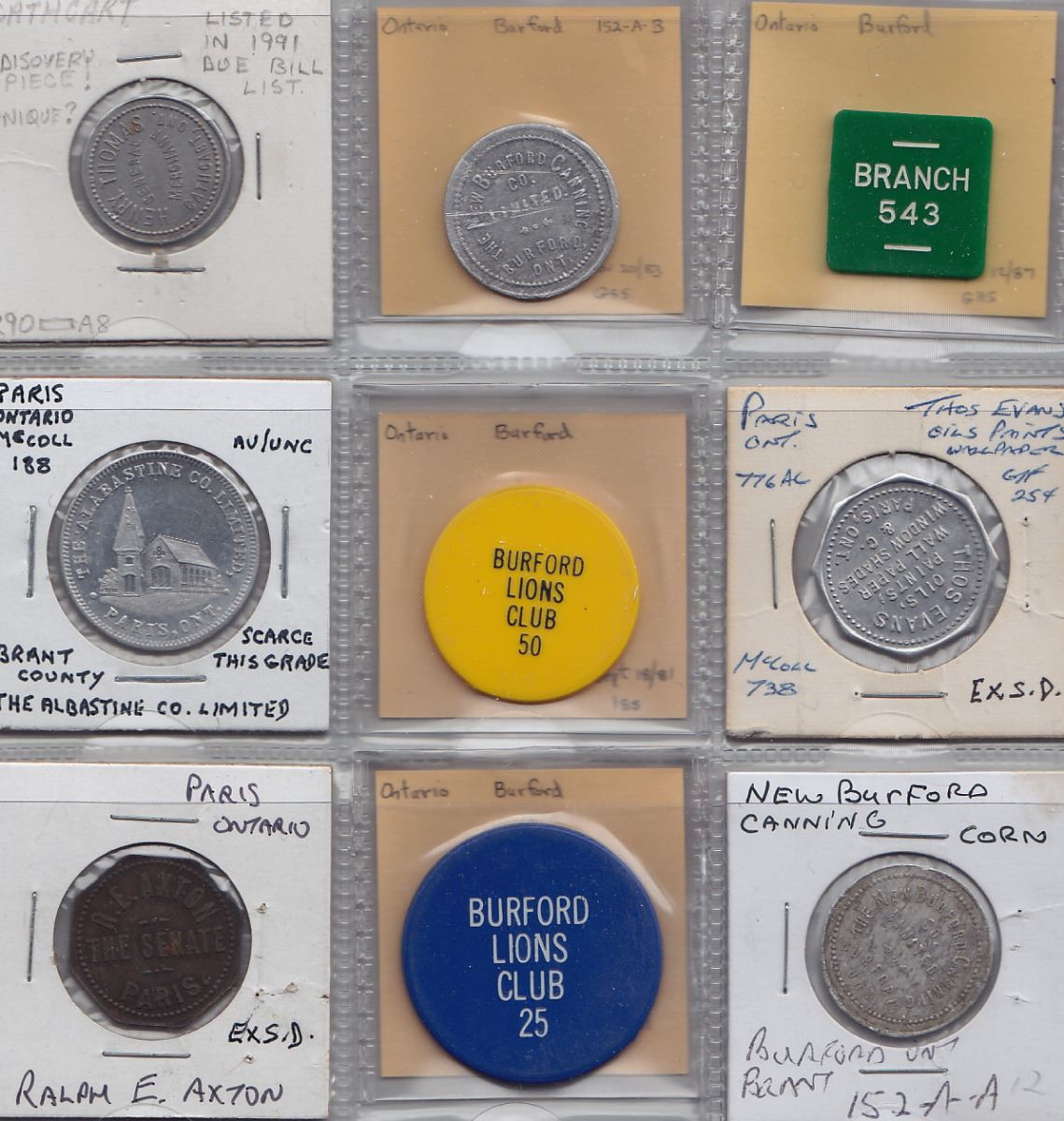Includes: Bo 152-A-A The New Burford Canning/ Corn; Bo 152-A-B The New Burford Canning/ Tomatoes; Burford Lions Club 25; Burford Lions Club 50; Branch 543 Burford; Henry Thomas Cathcart, Ont. Rev: 5c; Mc 188 The Alabastine Co. Paris, Ont.; Bo 776-A-C Thos Evans, Paris, Ont., R.E. Axton Paris 1c. F-UNC. 9 Pcs.