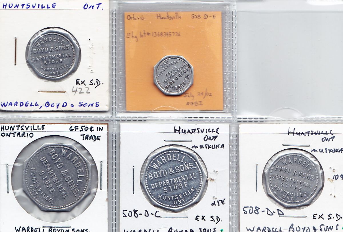 Includes: Bo 508-A-A to A-F J.E. Fisher Rev: $1, 50c, 25c, 10c, 5c and 1c; Bo 508-B-A to B-F Hanna & Hutcheson Bros. Rev: $1, 50c, 25c, 10c, 5c and 1c; as previous Bo 508-B-F flan resembles a train wheel; Bo 508-C-B to C-F Harry L. Heath Rev: 50, 25, 10, 5 and 1; Bo 508-D-A to D-F Wardell, Boyd Rev: $1, 50c, 25c, 10c, 5c and 1c. F to EF. 24 Pcs.