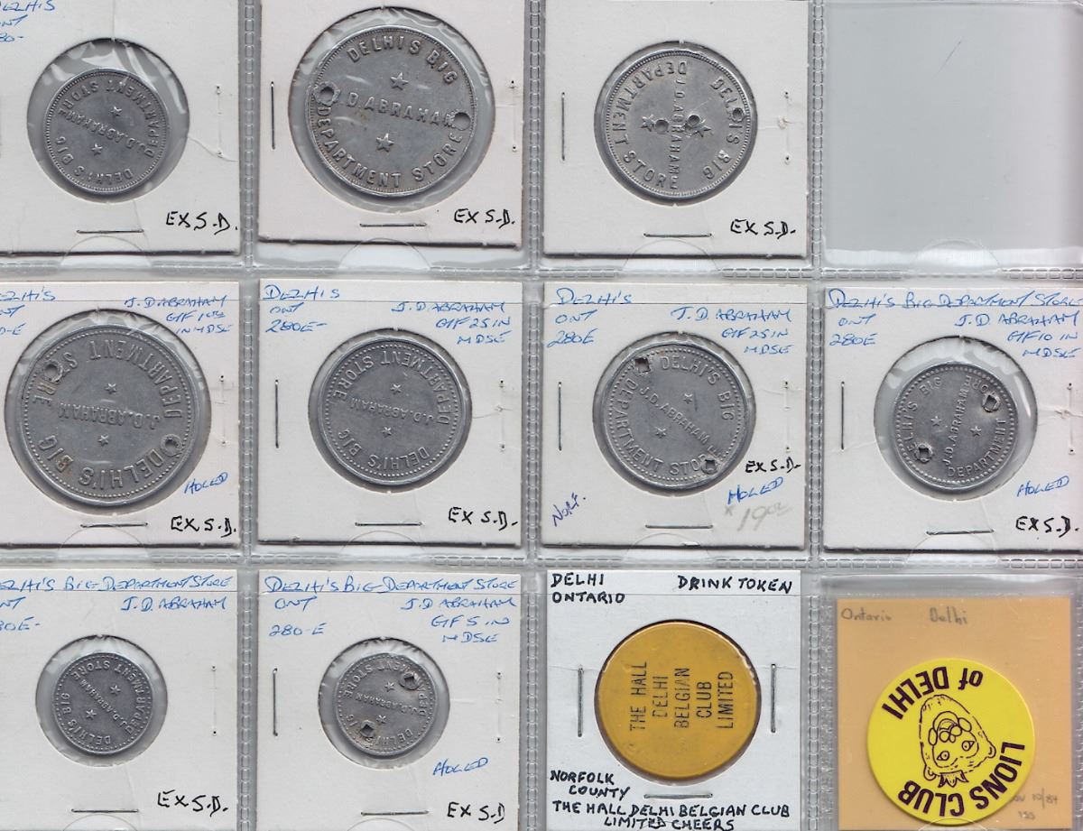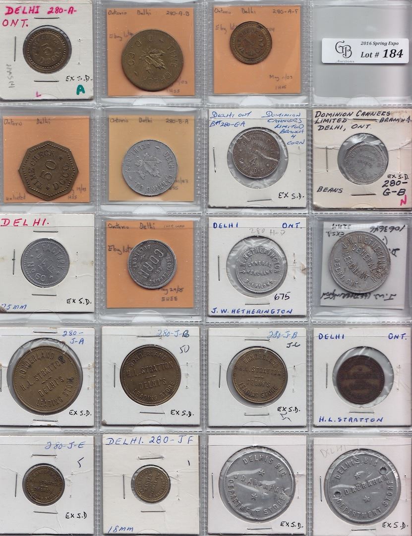 Includes: Bo 280-A-B A-F D.C. Co. Rev: 50 and 1; as previous Rev: 5 and 50 unlisted; Bo 280-B-A Delhi Canning Co. Rev: 2 1/2; Bo 280-G-A G-B Dominion Canners Rev: corn and beans; D.C. Ltd. No. 60 Rev: tomatoes; Delhi Canning Corn; Bo 280-H-D J.W. Hetherington Rev: 10c; as previous Rev: 50c; Bo 280-J-A to J-F H.L. Stratton Rev: 1.oo, 50, 25, 10, 5 and 1; J.D. Abraham Rev: large numbers 100, 100 holed, 50 holed, 25 holed and 10; as previous but small numbers 1.oo holed, 25, 25 holed, 10 holed, 5 and 5 holed; Delhi Belgian Club; Loins Club. F to EF. 30 Pcs.