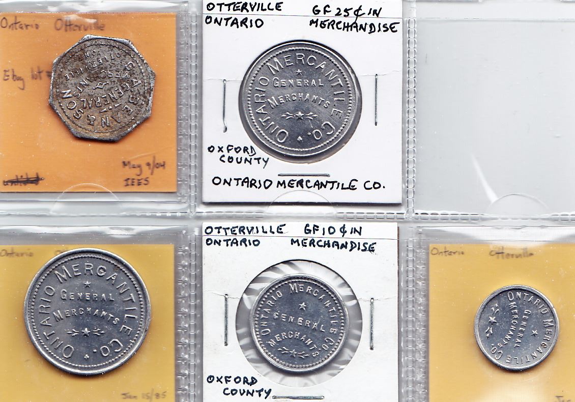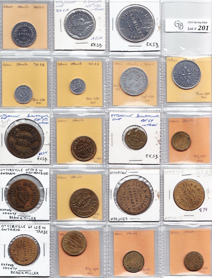 Includes: Bo 764-A-A A-Ax A-C to A-G S.S. Smiley Rev: $1, $1, 25 cents, 10 cents, 5 cents, 1c; Smiley, Hemstreet Co. Rev: July 1st 1895; Bo 764-B-A Bean & Miller Rev: $1; as previous Rev: 10c, 5c and 1c; as previous Rev: 50c and 25c; as previous but different obverse type Rev: $1, 50c, 25c, 10c, 5c and 1c; G.A. Bean and Son Rev: 25c; Ontario Mercantile Co. Rev: 50 cents, 25 cents, 10c and 5c. G to EF. 24 Pcs.