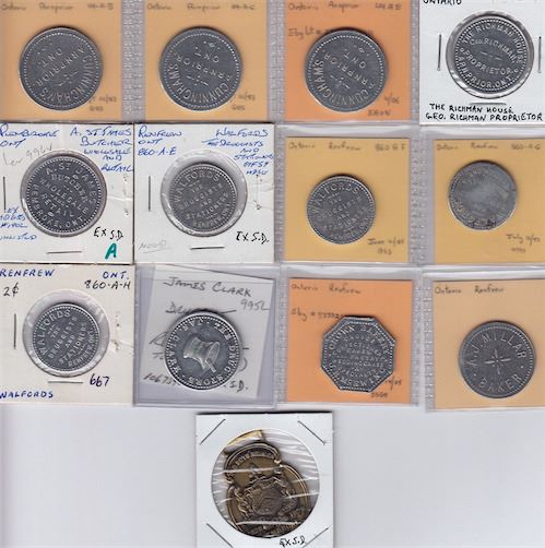 Includes: Bo 44-A-B, C, E, Cunningham’s, Arnprior, Al., all Unc; Mc 1206, Richman House, Arnprior, Al., BU; Ler 996y, A. St. James, Arnprior, Al., BU; Bo 860-A-E, F, G, H, Walford’s, Renfrew, Al., Fine to Unc; James Clark, Druggist, Renfrew, advert. Piece, Al., BU; Crown Bakery, Renfrew, 2 lb. Loaf, Al., Unc; A.J. Millar, 1 loaf, Al., Unc; Old Boy’s Reunion, Pembroke, 1928, brass fob, Unc. 13 Pcs.