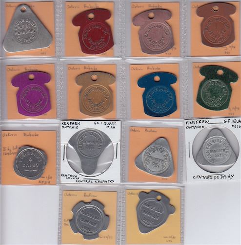 Includes: Brum’s Dairy, Pembroke, 1 quart, Al., plain, AU; 1 quart Homo, Al., red, aEF; 1 quart skim, Al., rose, EF; 1 quart 2%, Al., brown, EF; 2 quart Homo, Al., pink, EF; ½ gallon 2% Homo, Al., gold, EF; one 3 quart jug Homo, Al., blue, EF; 3 quart jug 2%, Al., green, EF; Pembroke Dairy, 1 quart, Al., Unc; Central Creamery, Renfrew, 1 quart, Al., VF+; Centreside Dairy, Renfrew, 1 quart of milk, Al., VF; Centreside Dairy, Renfrew, 1 quart milk, Al., EF; Maple Leaf Dairy, Renfrew, 1 quart, Al., VF+; 1 quart, cow’s head, top hole, Al., Fine+. 14 Pcs.