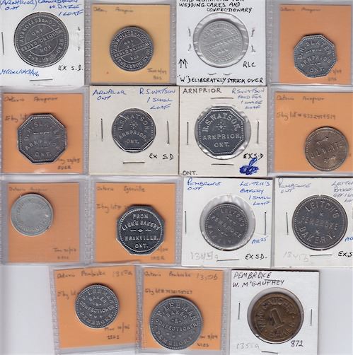 Includes: As 0070a, b, Crown Bakery, Arnprior, 1 loaf, Al., EF; ½ loaf, Al., Unc; ½ loaf, different style and w. overstruck W, Al., VG; As 0075a, b, D.H. Slater, Arnprior, ½ loaf, Al. [unlisted],1 small loaf, Al., Unc; 1 large loaf, Al., EF; As 0080a, b, R.S. Watson, Arnprior, 1 small loaf, Al., Unc; 1 large loaf, Al., Unc; As 0085a, b, J.L. Whyte, Arnprior, 1 loaf, Al., Fine; 1 small loaf, Al., VG; As 00420a, Lisk’s, Eganville, 1 loaf, Al., BU; As 1345a, b, Leitch’s, Pembroke, 1 small loaf, Al., Unc; 1 large loaf, Al., Unc; As 1350a, b, F. Lehman, Pembroke, ½ loaf, Al., BU; 1 loaf, Al., EF; As 1355a, W. McGaughey, Pembroke, 1, brass, aEF. 15 Pcs.