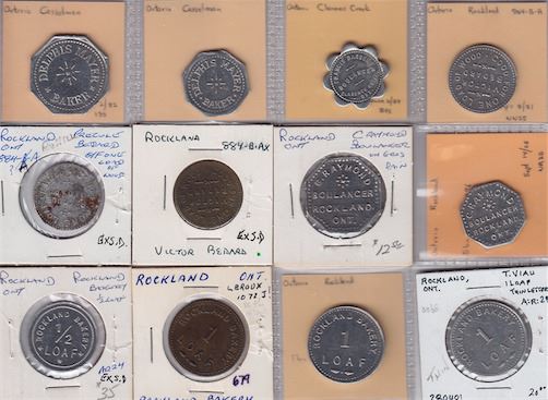 Includes: As 0265a, b, Delphis Mayer, Casselman, 5¢ Loaf, 20¢ Loaf, Al., both Unc; As 0305a, François Barbeau, Clarence Creek, Un Petit Pain, Al., Unc; Bo 884-A-A, Percule Bedard, Rockland, Al., VG; Bo 884-B-A, Al., Ax, brass, Victor Bedard, Rockland, both Unc; As 1520a, b, C. Raymond, Rockland, Un Gros Pain, Al.; Un Petit Pain, Al., both Unc; As 1525, Rockland Bakery, ½ Loaf, Al., Unc; As 1525e, Leroux 1072J, Rockland Bakery, 1 Loaf, brass, AU; As 1525g, h, T. Viau, Rockland Bakery, 1 loaf, thick and thin Al., EF and AU. 12 Pcs.