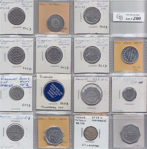 Includes: British Canadian Canners (Port Robinson) Rev: bean check in 1982 suppl; Bo 872-A-A to A-E S.P. Townsend Ridgeville Rev: 1.oo, 50, 25, 10 and 5; Bo 880-A-D A-F Bean & Krafft Ridgeway Rev: 10 and 1; Thunderbird Inn Ridgeway Rev: 5c; Bo 928-A-C A-F Thos. Desantis Sherkston Rev: 25c and 2c; as previous Rev: 1c in 1982 suppl; Bo 1028-A-E Alfred J. Clarke's Thorold Rev: 5 per cent; Br 756 J.C. Lampman Thorold Rev: 5; C.Y.M.C. Thorold Rev: 5c. VF to EF. 15 Pcs.