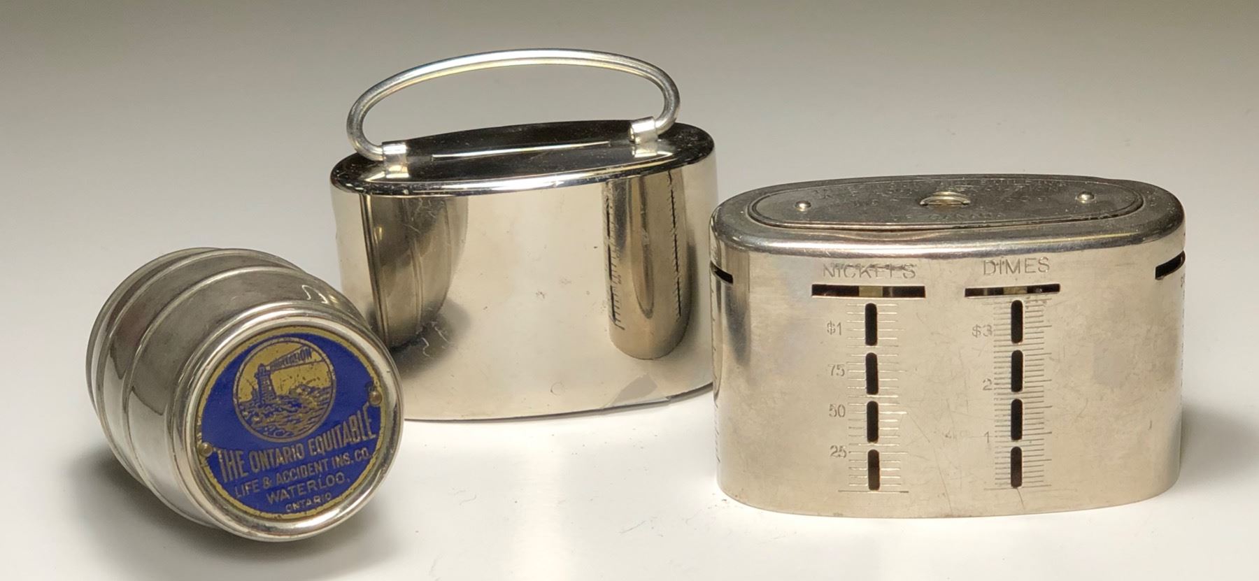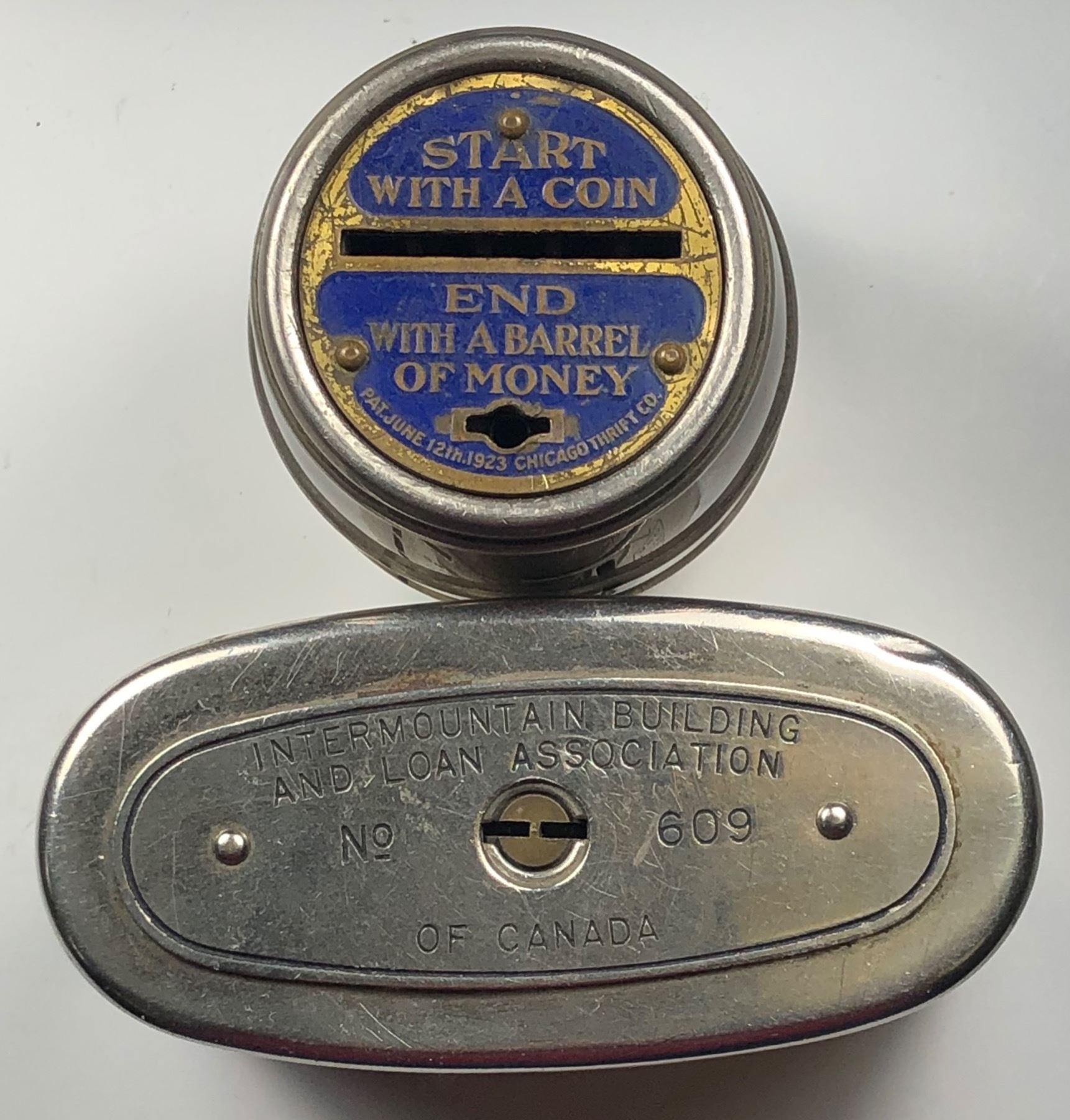 The Ontario Equitable Life & Accident Ins. Co. Waterloo, Ontario, barrel shape, chrome; Intermountain Building And Loan Association Of Canada, chrome, oblong shape; generic chrome oblong bank. 3 Pcs.