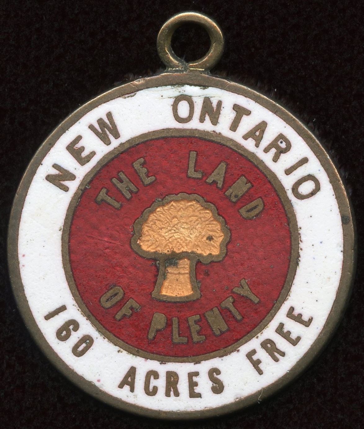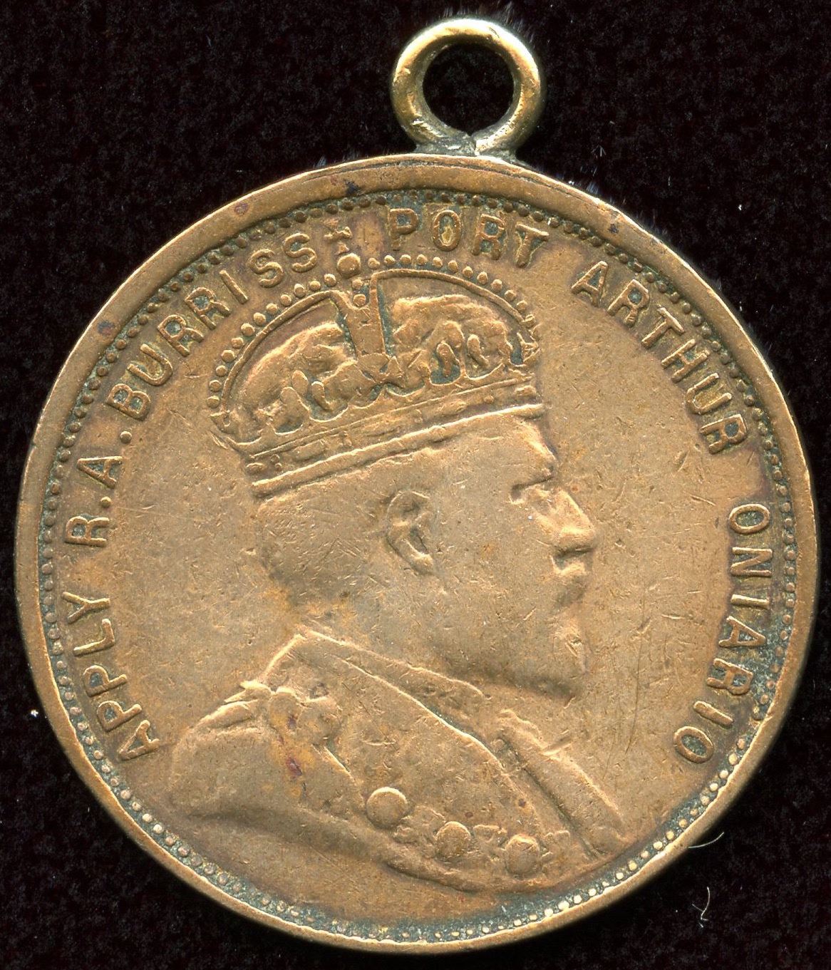 Port Arthur, R.A. Burriss, real estate token, Edward VII on obverse and New Ontario 160 acres free on the reverse enameled. A scarce token looped at the top.