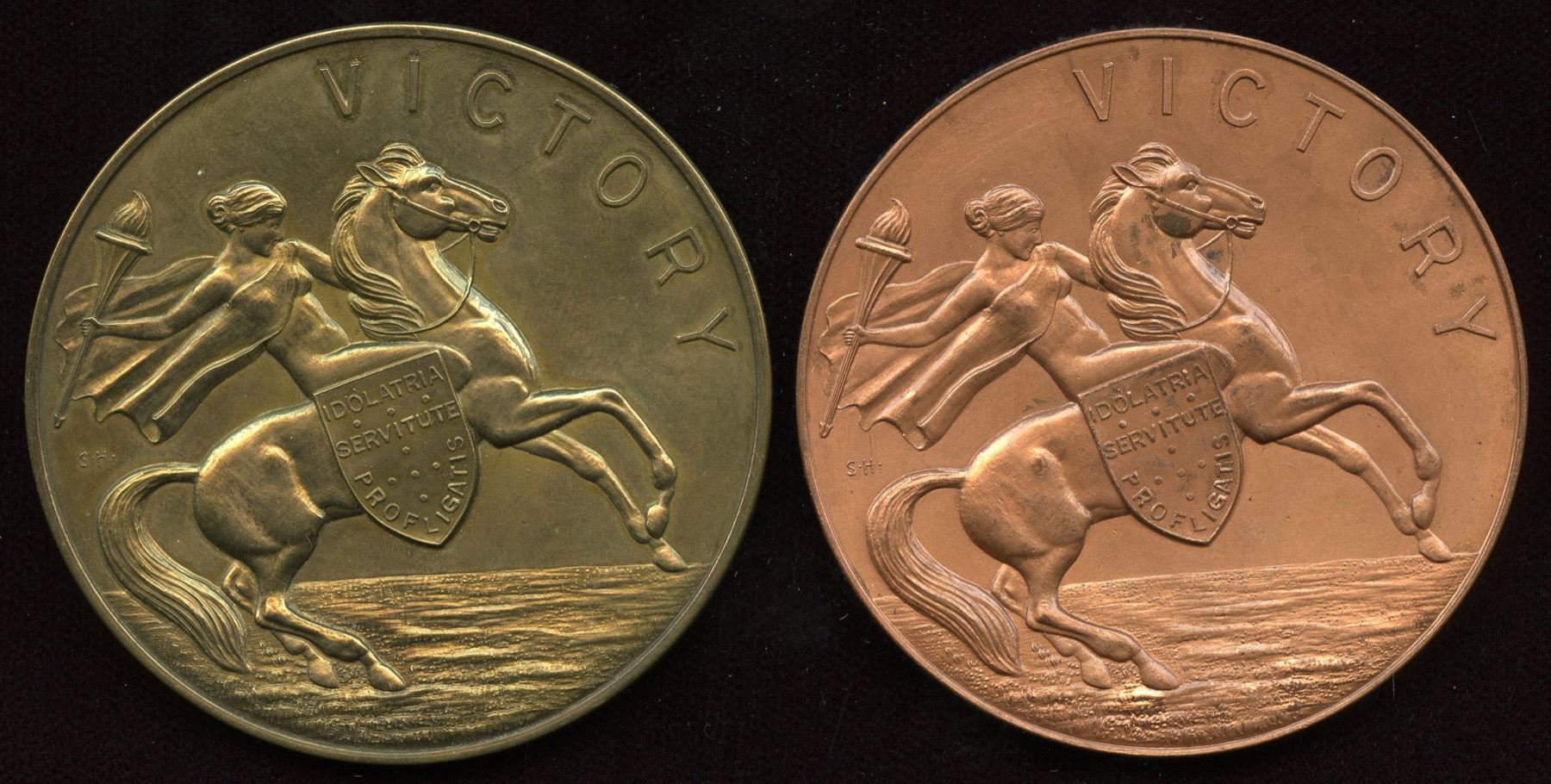 A very rare Winston Churchill medal proposed by a committee of citizens of Peterborough, Ontario. It appears that President Roosevelt and Churchill visited that city in 1942. Stanley Hayman engraved the medal and it seems to have been issued in copper, silver and gold-plated. Norman Wells states 15 to 20 specimens were made and is represented in Engstrom's book on Churchill Medallic Portraits. In this lot is a copper specimen with a uniface gold-plated specimen. 2 Pcs.
