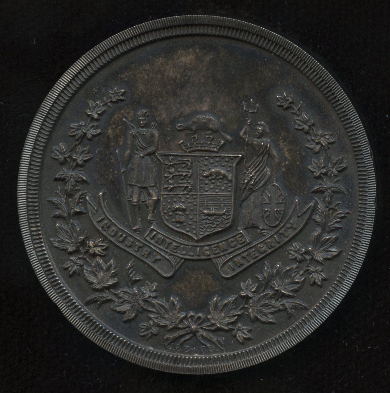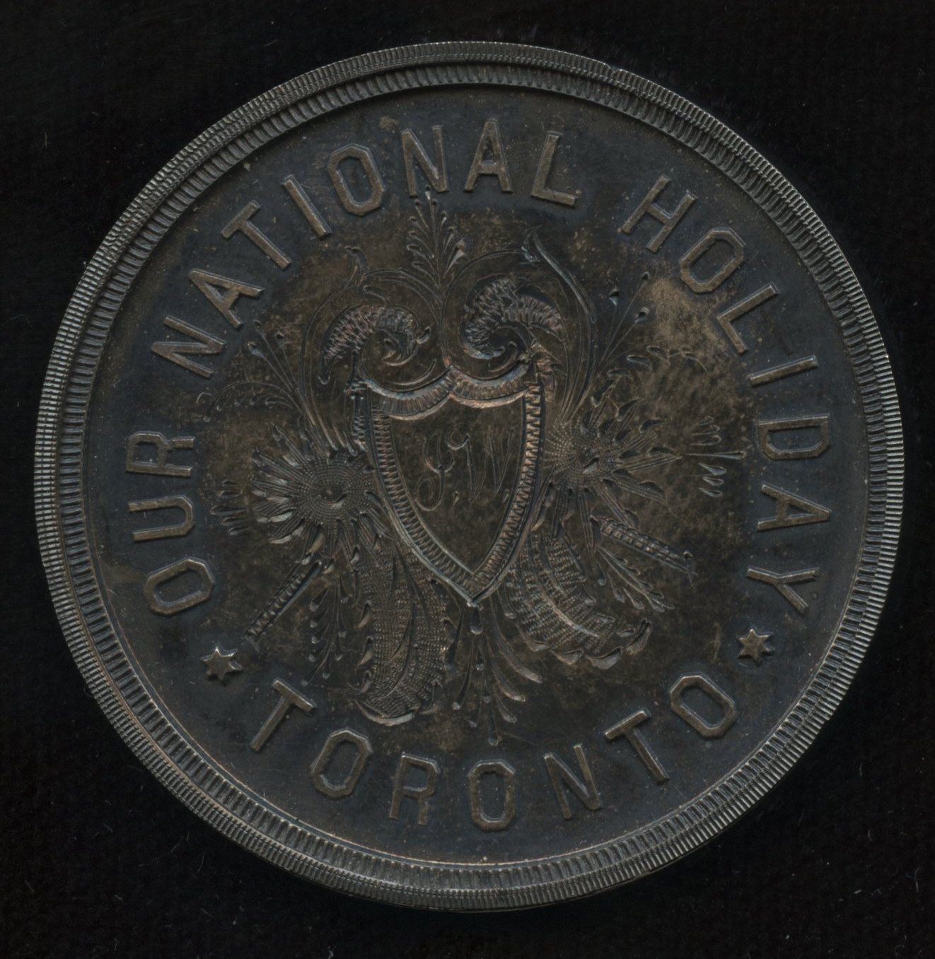An unlisted Leroux silver specimen struck by James Ellis & Company. Shortly after confederation, the firm produced the "Our National Holiday" medal for use as awards in various Dominion Day competitions. There is an initial "JW" engraved on the shield presumably the awardee. In case of issue with fastener missing. A very interesting and RARE medal.
