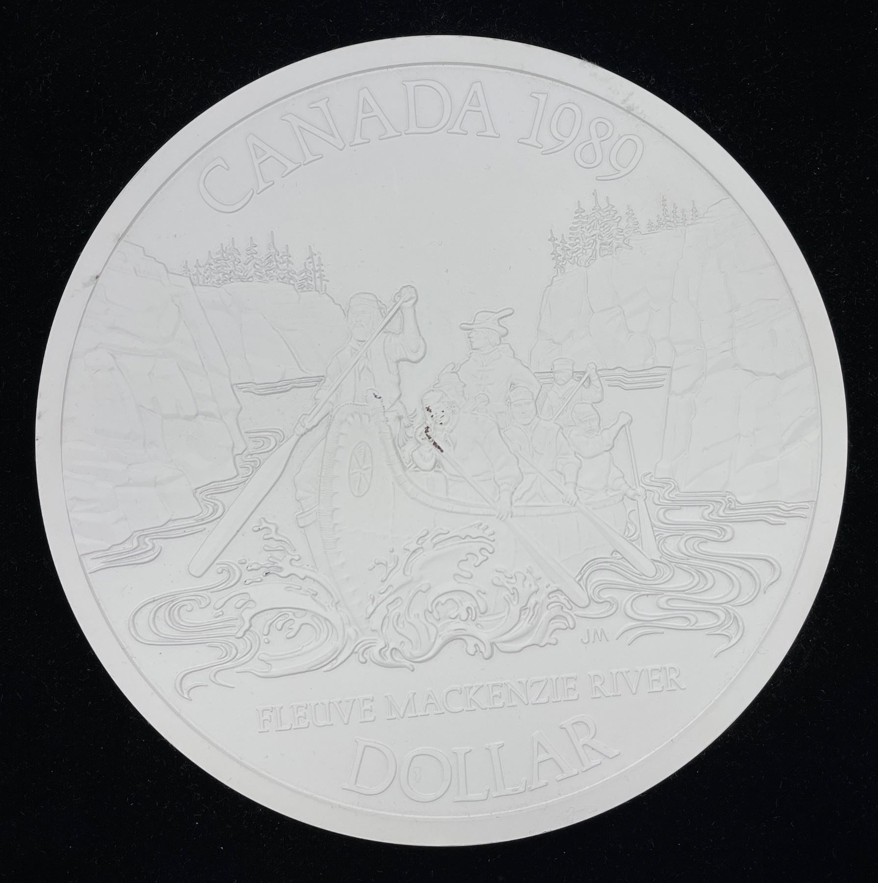 Original plaster model produced by the Royal Canadian Mint and Senior Engraver Sheldon Beveridge for the 1989 Commemorative Silver Dollar bi-centennial of the McKenzie River. Very very unique, very desirable and very collectible! Approximately 8" in diameter, obtained from the Royal Canadian Mint.