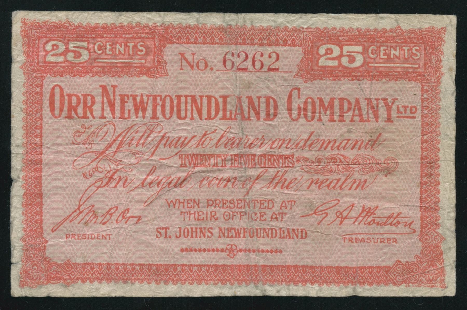 NL-65-10-06. James B. Orr came to Newfoundland as an agent for Swift Meat Packers, but soon became a travelling salesman. In 1912 he introduced rubber boots to Newfoundland. Orr issued notes about 1920 as an advertising gimmick. A register of surviving notes is published in the CPMS newsletter, Sept. 2002, showed just two 5 cent notes and only one of each of the other denominations known to have survived. Unique. Ex: Eisenhauer, Bell.