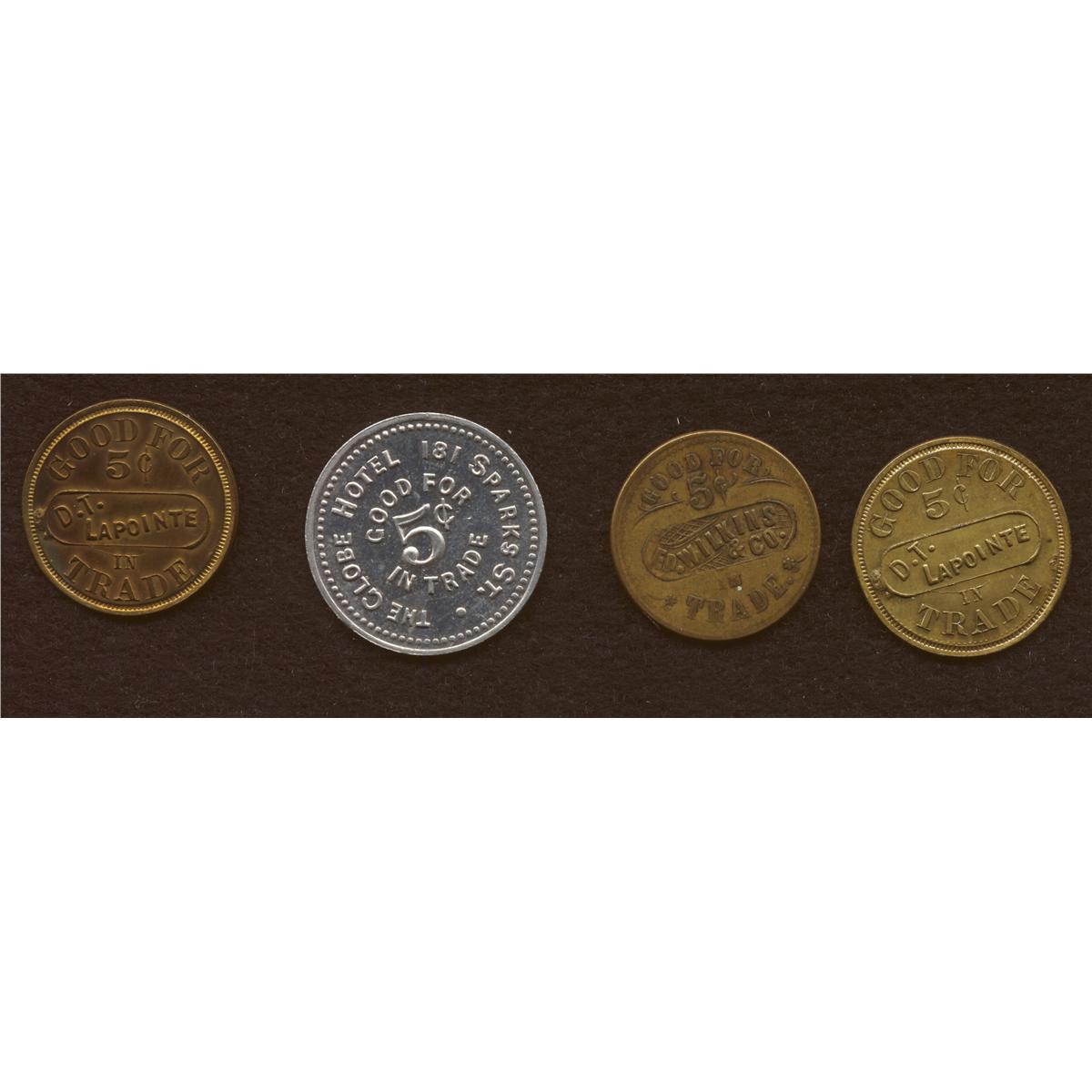 Globe Hotel, Al., 5 cents, E. D. Wilkins, unknown location, brass, 5 cents, D.T. Lapointe, brass, 5 cents, McColl 1219a, another of the same, (4 pcs.)*
