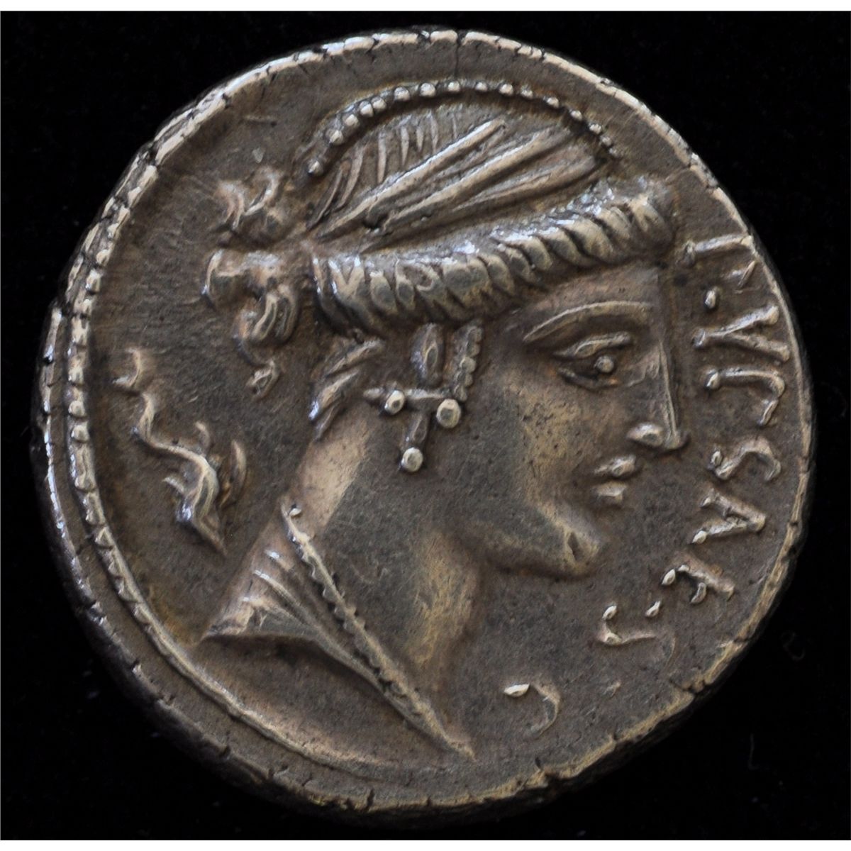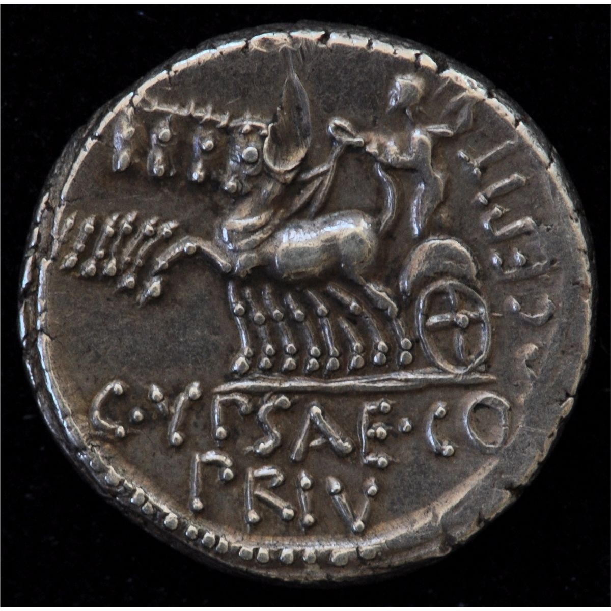 P. Plautius Hypsaeus (60 BC) - AR-Denarius Obv:Bust of Leuconoe r.,dolphin behind and P.YPSAE S.C. to right. Rev: Jupitur in quadriga l. CEPIT on right in ex P YPSAE S C. 4.1 grams, S-376 Craw 420-2A AEF.