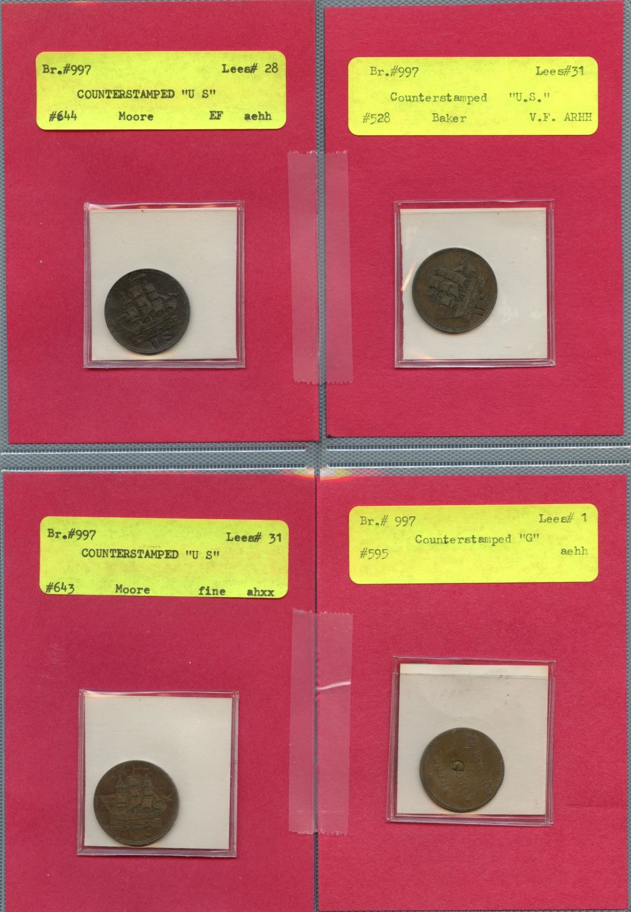U S on Half Penny Ships and Commerce, Br. 997, Lees #28. U.S. on Half Penny Ships and Commerce, Br. 997, Lees #31. U S on Half Penny Ships and Commerce, Br. 997, Lees #31. G on Half Penny Ships and Commerce, Br. 997, Lees #1. Part of the Dickieson Collection. 4 Pcs.