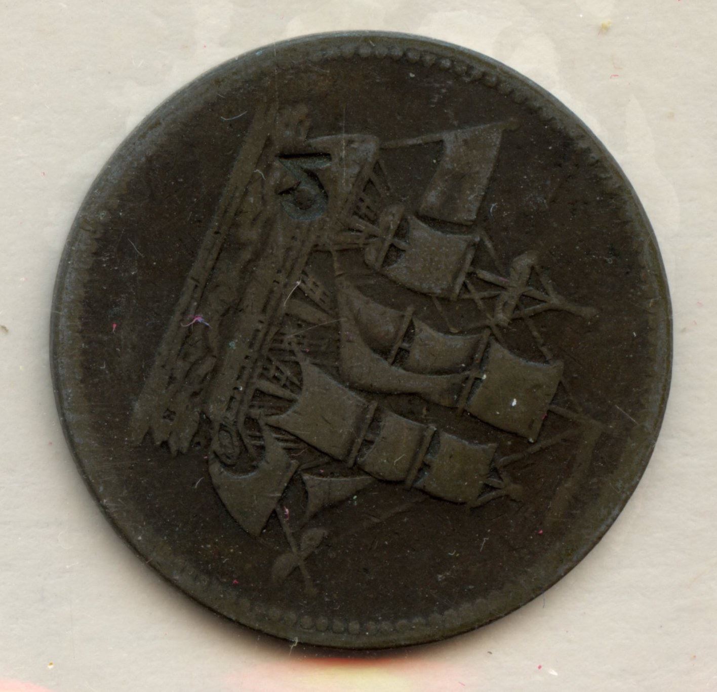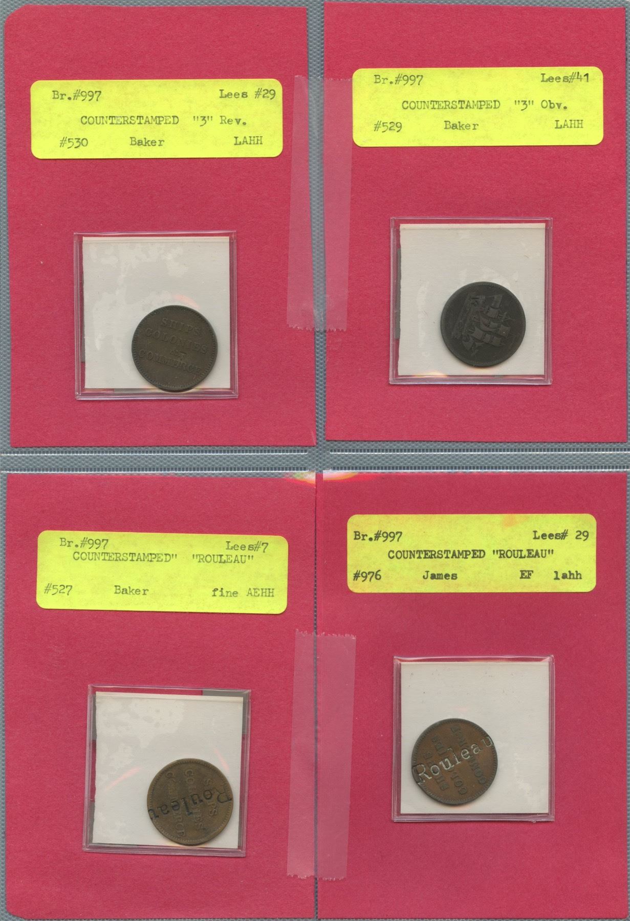 3 on Half Penny Ships and Commerce, Br. 997, Lees #29. 3 on Half Penny Ships and Commerce, Br. 997, Lees #41. Rouleau on Half Penny Ships and Commerce, Br. 997, Lees #7. Rouleau on Half Penny Ships and Commerce, Br. 997, Lees #29. Part of the Dickieson Collection. 4 Pcs.